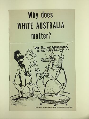 Pamphlet entitled 'Why Does White Australia Matter?', published by the Victorian Association for Immigration Reform, Melbourne, circa 1968. It is one of three duplicate copies which make the case for the end of the White Australia policy and expound the arguments laid out in the the Immigration Reform Group's seminal work 'Immigration Control or Colour Bar?' published in 1960. The pamphlet features an evocative cartoon of a martian standing in front of two men with black and white skin asking 'Now tell me again! What's the Difference?' The Association had branches in Victoria, New South Wales, South Australia, Western Australia and the ACT.