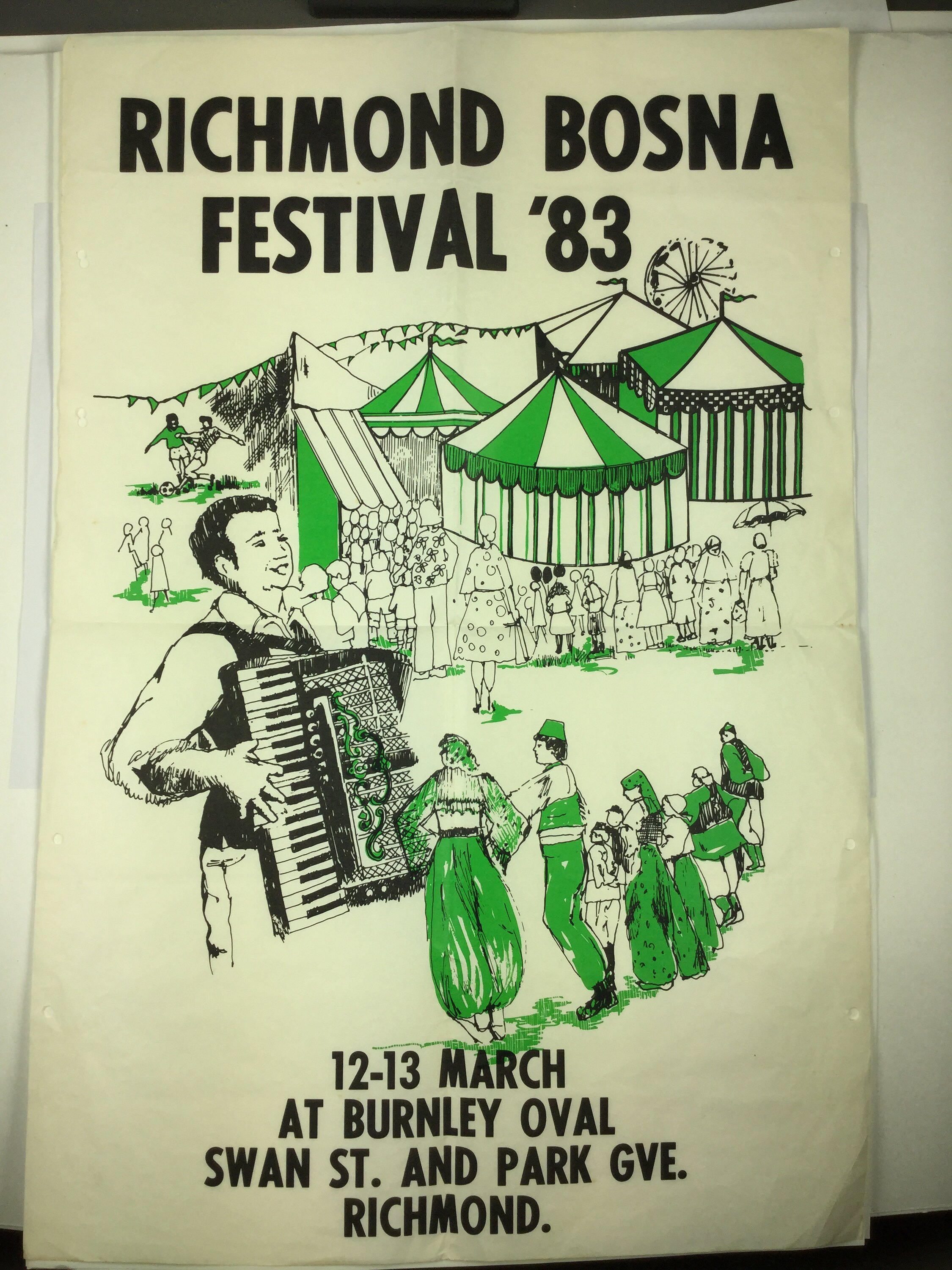 Poster for the 'Richmond Bosnia Festival '83, held on the12-13 March, 1983 at the Burnley Oval, Swan Street, Richmond. It was an annual cultural festival organised by the Bosnian Melbourne Soccer Club.