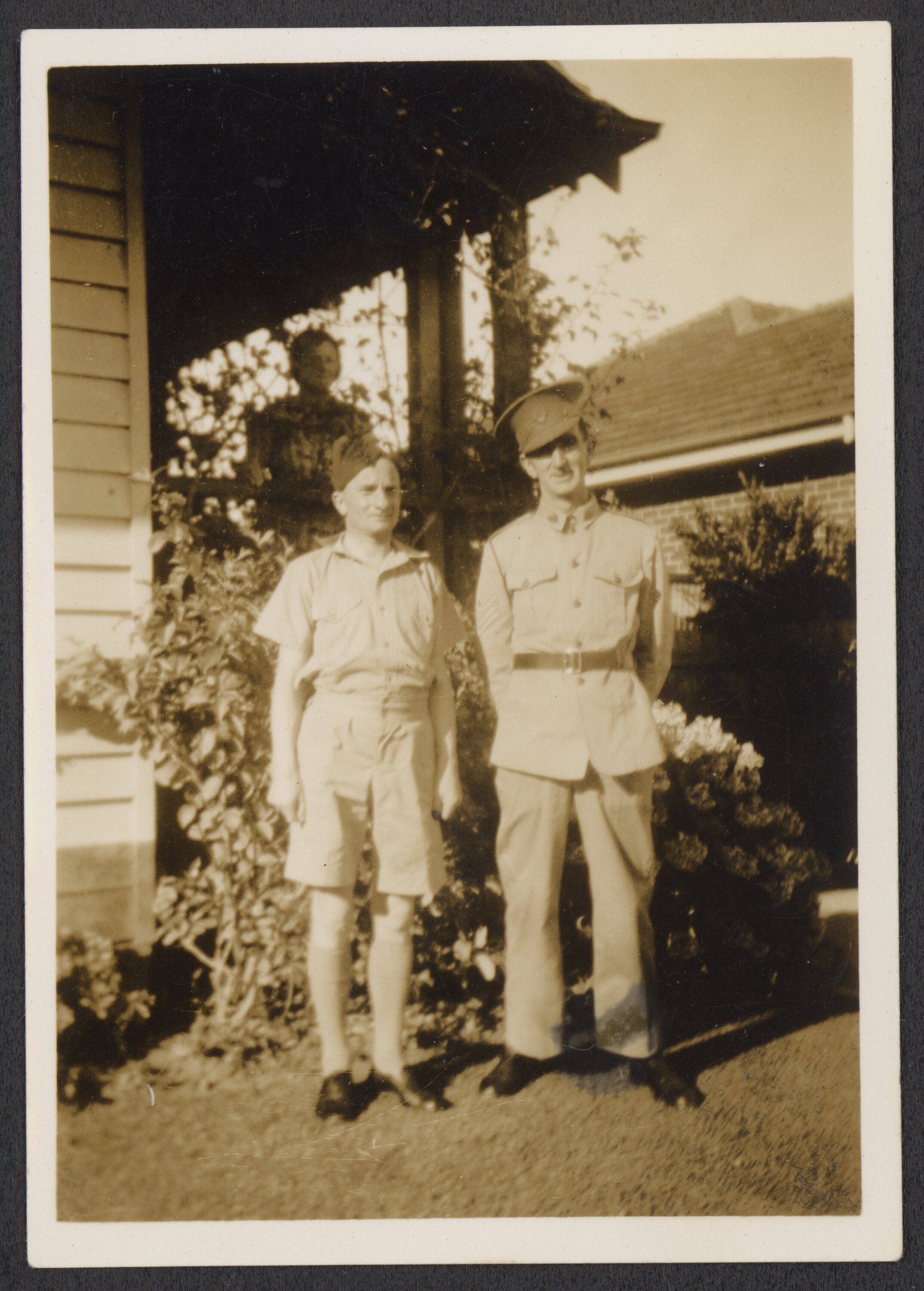 Taken at the residence of Nell's sister Emily French (nee Baker, known as Sis) and her husband Jack, at 7 Malvern Avenue, Glen Iris. The people are as follows: Ellen McPhee (nee Baker, known as Nell) on the verandah; Arthur Baker (Nell's brother) in the air force uniform on the left and John Albert McPhee (Nell's husband, known as Jack) in army uniform on the right.