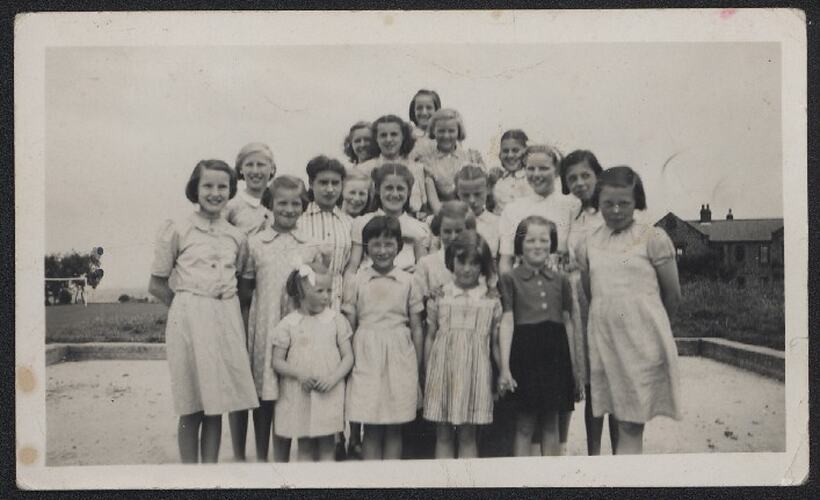 Photograph of all the girls who lived in the same house as Sheila Philpott (Bannister) at the National Children's Home, Bramhope, England, some time during1941-1950. Sheila is fourth from the left in the second row (head only).