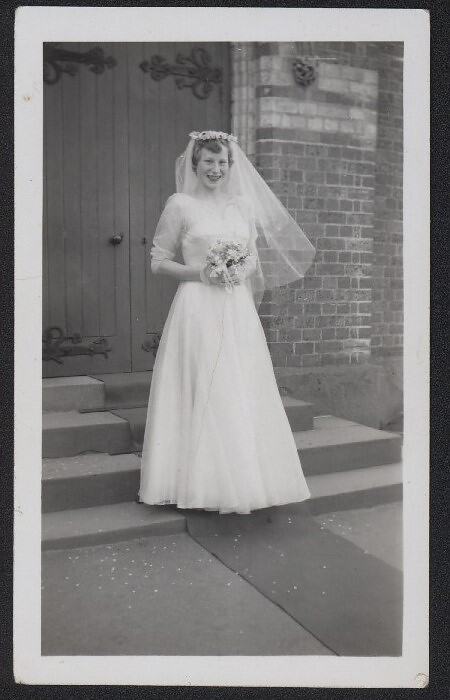 Photograph of Sheila Philpott (nee Bannister) as a bride on her wedding day, Melbourne, Australia, 22 January 1955.