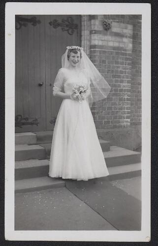 Young woman standing on the steps of a brick church in her wedding dress, with a veil and holding a floral bouquet. There is a green printed number and a pencilled number on the reverse.
