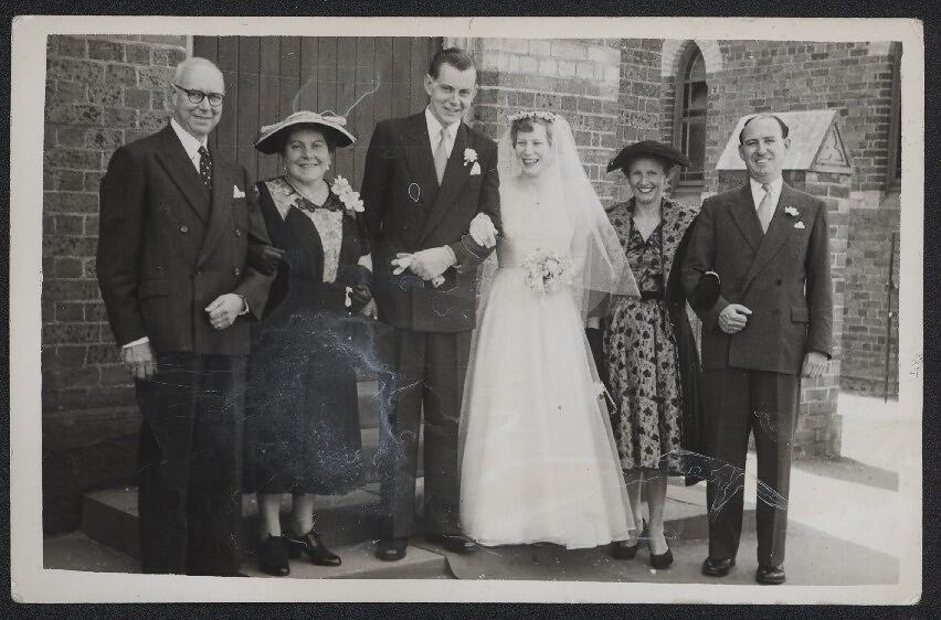 Photograph of Sheila and Eric Philpott's wedding party on a church's steps, Melbourne, Australia, 22 January 1955. The group, from left to right, comprises, Arthur Philpott and Eva Philpott, Eric Philpott, Sheila Philpott (nee Bannister), Mrs Barrett and her husband, Dr Barrett, Sheila's former employers. Dr Barrett gave Sheila away at her wedding ceremony.