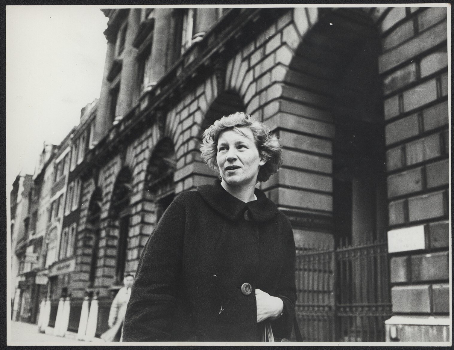 Woman in a dark buttoned-up coat, shown from waist up, with her left hand tucked inside her coat and with a handbag on her arm. She is standing outside the iron railing entry gate and arched windows of a three-storey, stone Victorian building with Corinthian columns on the upper floors. There is a purple-inked stamp on the reverse.