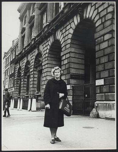Photograph of Shelagh (formerly Sheila) Philpott (nee Bannister) outside Somerset House, London, England, 10 September 1965. Shelagh had travelled from Australia in August on a quest to find her family and her story was followed and reported by the Daily Express newpaper in London.