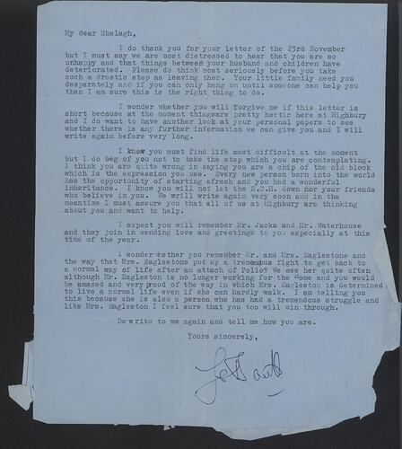 Proforma aerogramme letterhead: [insignia]: 'BY AIR MAIL / PAR AVION / AIR LETTER / AEROGRAMME'. [Black ink overstamp]: 'HIGHBURY / 5-15 PM/ 2 DEC / 1964 / N.5.' [postage stamp image]: '6D / SIXPENCE - POSTAGE 'Mrs S. Philpott, / ...( extended text).../ AN AIR LETTER SHOULD NOT CONTAIN ANY / ENCLOSURE; IF IT DOES IT WILL BE / SURCHARGED OR SENT BY ORDINARY MAIL.' On reverse:' My dear Shelagh, / I do thank you for your letter of the 23rd November / but I must say we are most distressed to hear that you are so / unhappy and that things between your husband and children have / deteriorated...(extended text)... / Do write to me again and tell me how you are. / Yours sincerely, / [signature].'