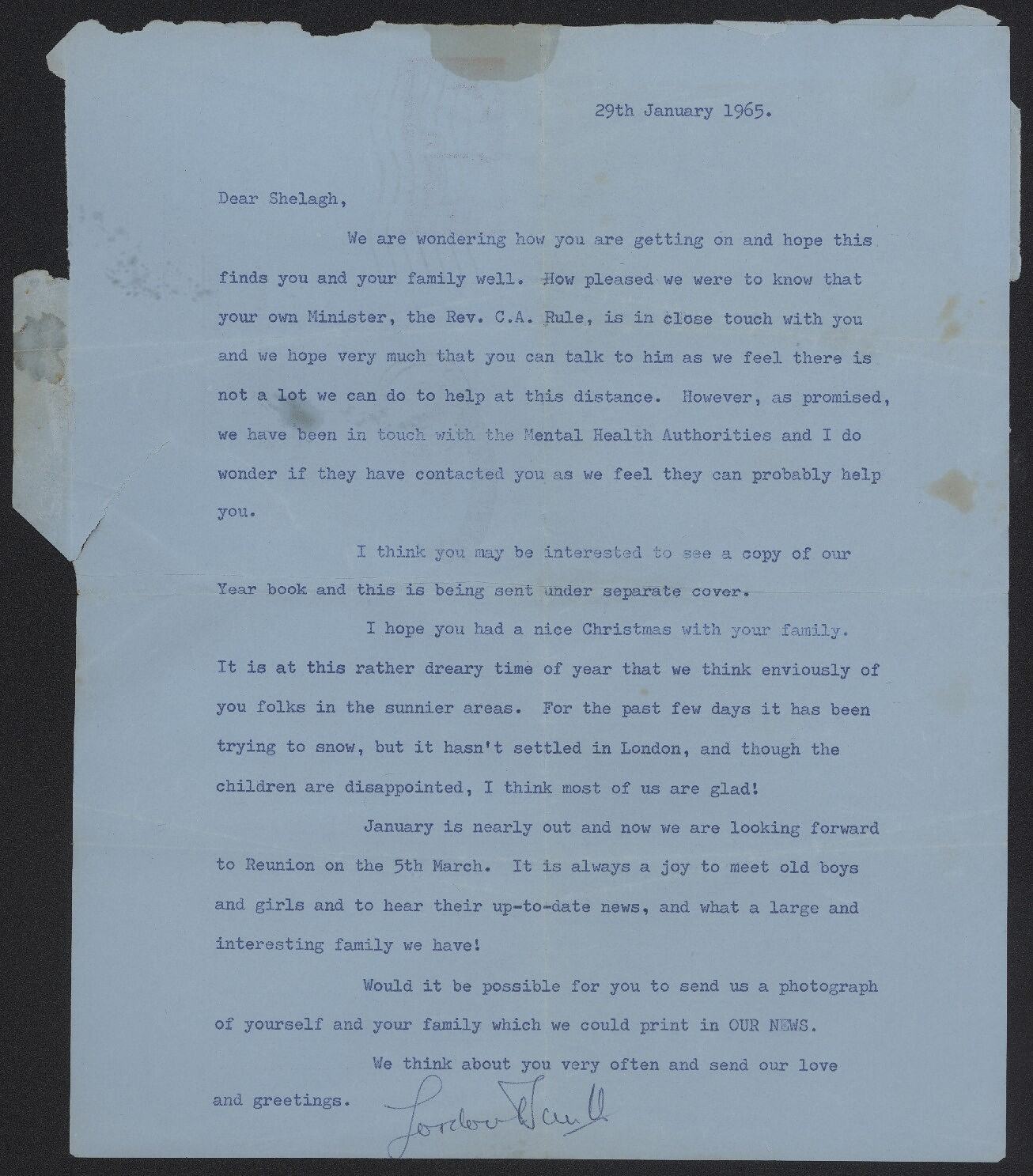 Aerogramme from Reverend Gordon Barritt of National Children's Home, 85 Highbury Park, London, England to Mrs E. [Eric] Shelagh (formerly Sheila) Philpott, 82 Charles Street, Kew, Victoria, Australia, 29 January 1965. The Rev Gordon Barritt was responsible for After-Care for the National Children's Home and Orphanage, London from about 1961. He wrote asking after her well-being, providing local news and noting how pleased he was that Rev Rule, her own Minister in Australia had been in touch with her.