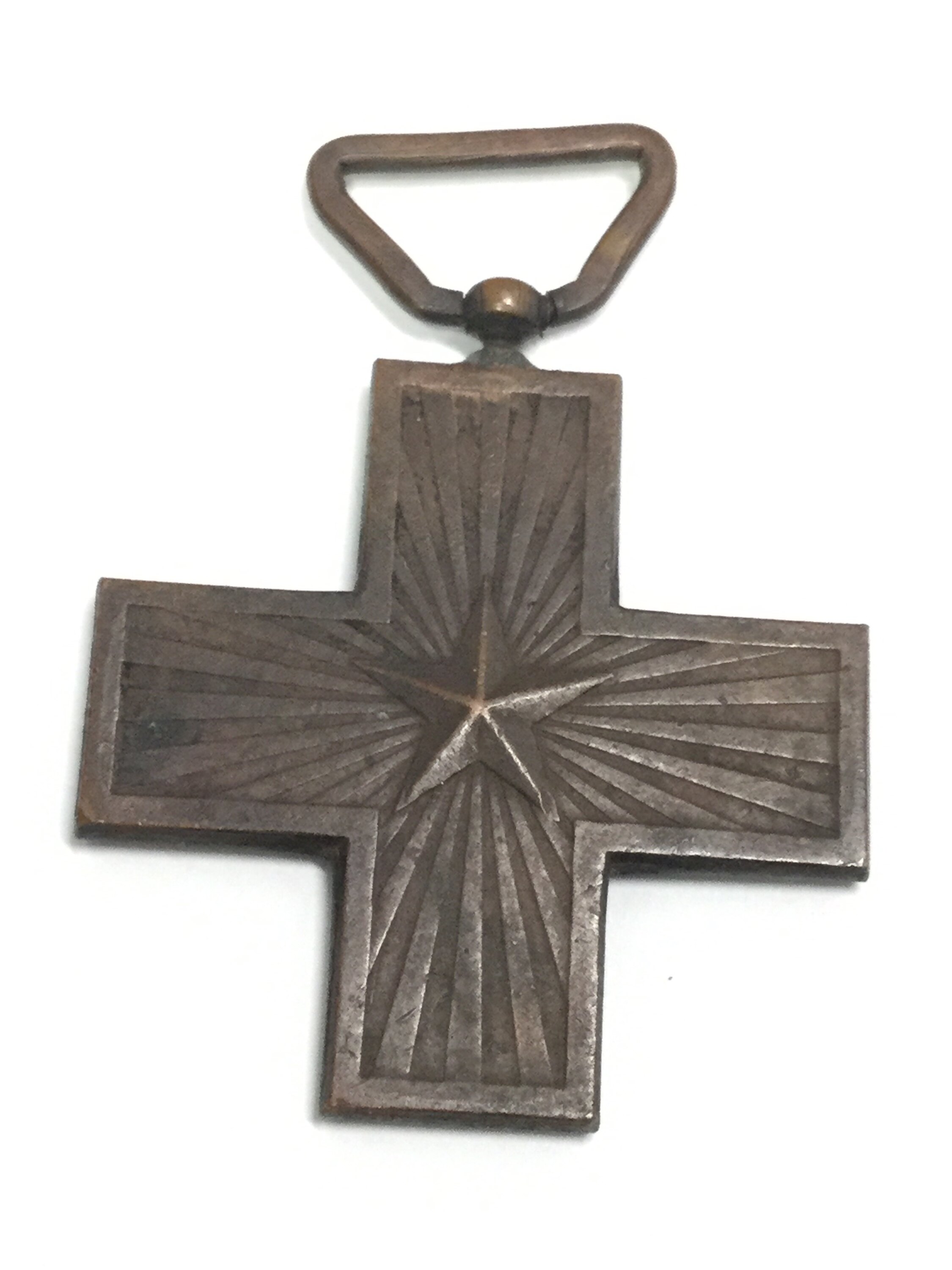 Bronze cross-shape medal with ring for suspension. The obverse features the royal cypher under a crown in the upper arm, MERITO DI GVERRA on the horizontal arms and a Roman sword point upwards, on oak leaves, in the lower arm. The reverse features a five pointed star on radiate background.