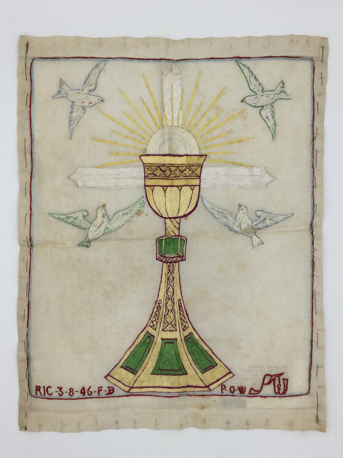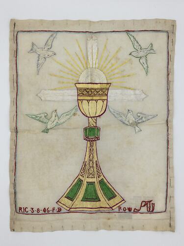 Altar cloth embroidered by Adorizio Faella, an Italian prisoner of war and given to Angelina Zarro as a expression of thanks for her family's support, in 1946. Angelina had followed her husband Antonio from Italy soon after he migrated to Melbourne in 1924.