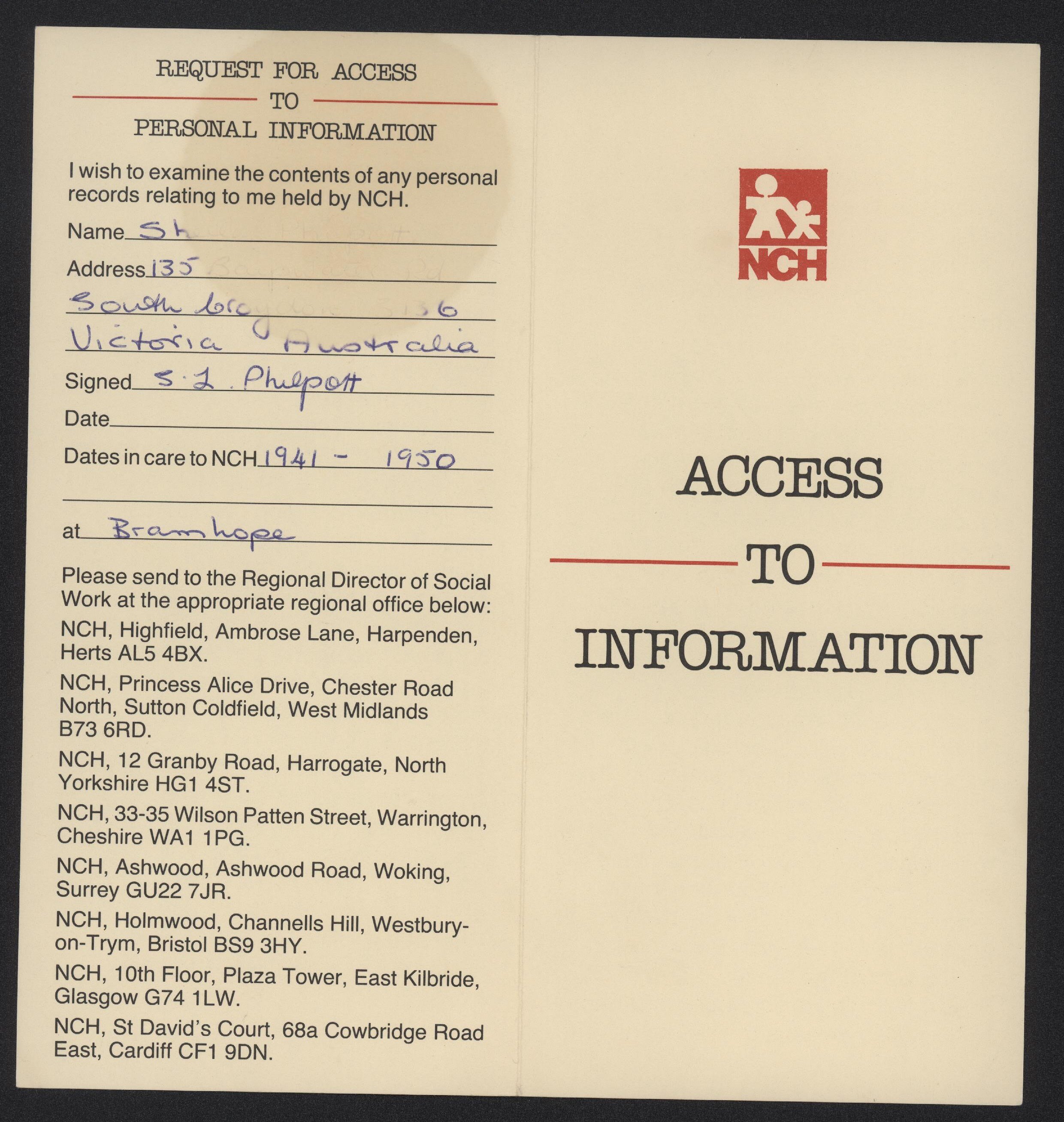 Part of a collection of documents, photographs and an oral history inteview relating to Shelagh (formerly Sheila)Philpott (nee Bannister), an unaccompanied British child migrant. The material documents her time in care in the National Children's Home and Orphanage in England at Bramhope, near Leeds; her migration to Australia in 1950 and her efforts to trace her family later in life. The research file includes photocopied material.