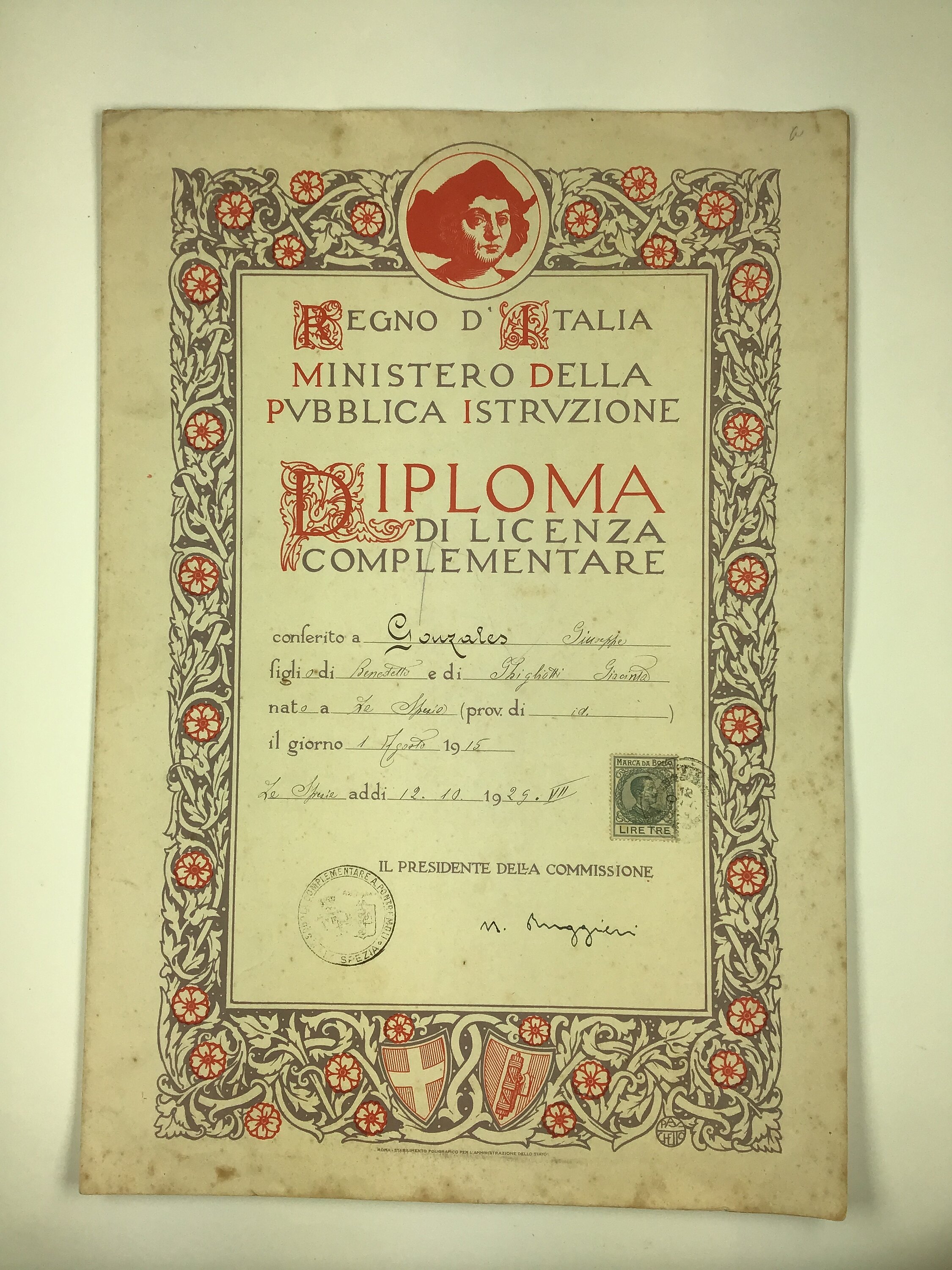 School diploma awarded to Giuseppe Gonzales, La Spezia, Italy 1 August 1915. Text is in Italian language.
