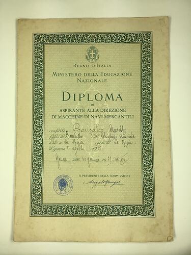 Diploma of Marine Engineering awarded to Giuseppe Gonzales, Ministry of National Education, Genoa, Italy, 30 January 1939.