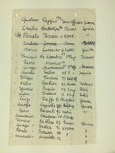 Passenger list, handwritten by Giuseppe Gonzales, documenting all the Italian crew on the Remo which sailed from Italy to Australia in 1940. The ship berthed at Fremantle a few days before Italy entered the War on 10 June 1940. The ship was seized by the Australian Government as a prize of war on 11 June 1940 and officers and crew were arrested as 'enemy aliens' and taken to internment camps. Crew members were sent to Rottnest Island and the officers to Harvey (Western Australia).