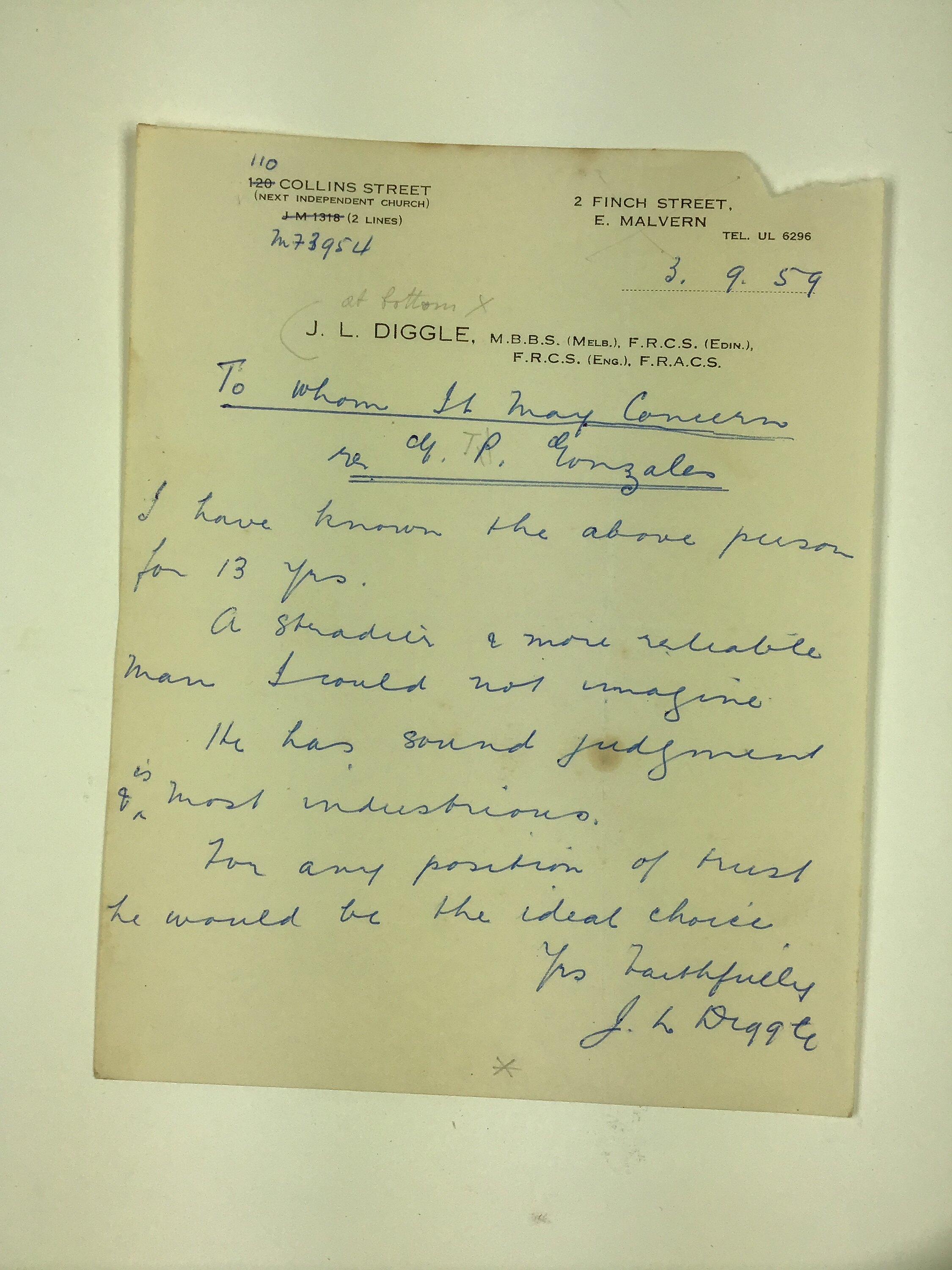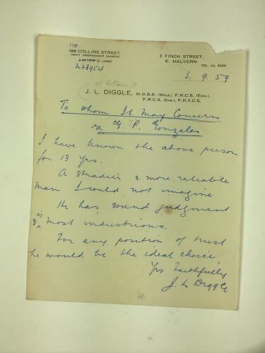 Handwritten character reference for Giuseppe Gonzales from J.L Diggle, 2 Finch Street, East Malvern, 3 September 1959, attesting to his good character and reliability and recommends him to any employer.