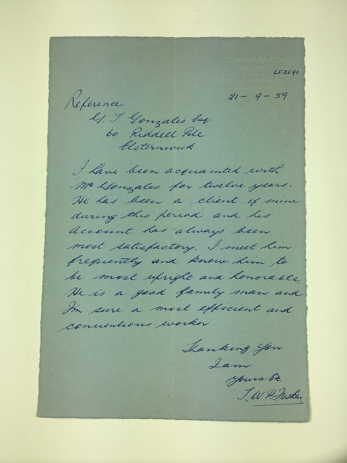 Handwritten character reference for Giuseppe Gonzales from J.W. Fisher, 21 September 1959. The reference stipulates Fisher has known Giuseppe for 12 years as his client and attests to his good character and recommends him to any employer.