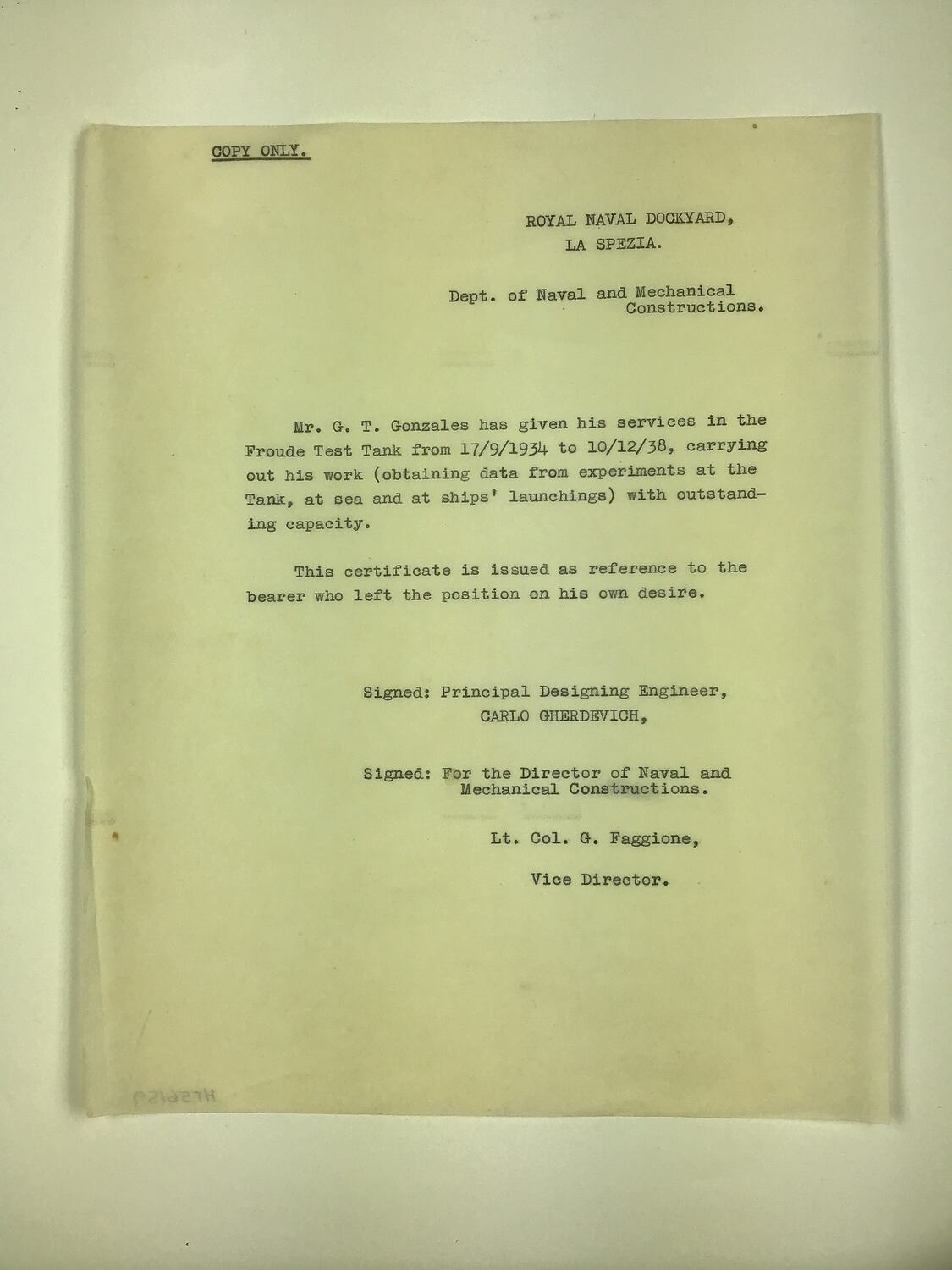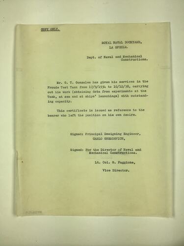 Typed employment reference for Giuseppe Gonzales from the Royal Naval Dockyard, La Spezia, Italy, 10 December 1938. The reference certifies that Giuseppe was employed by the company in their Froude Test Tank from 17 September 1934 to 10 December 1938.