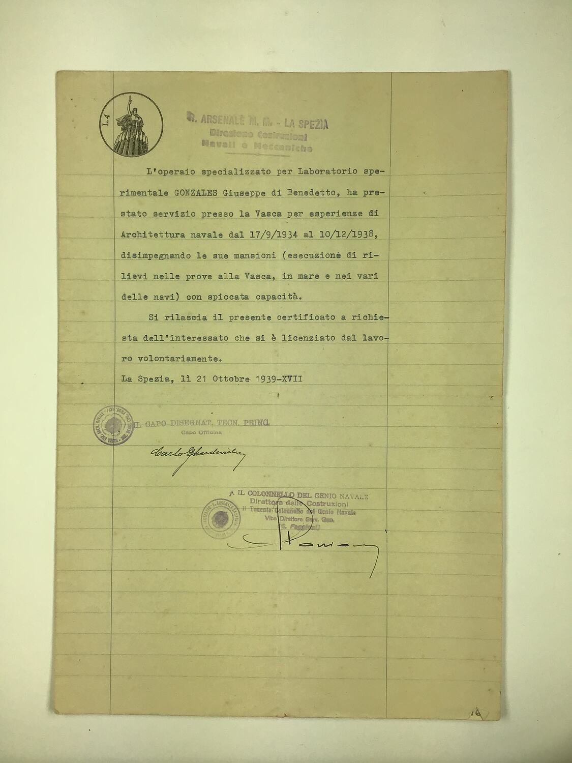 Typed employment reference for Giuseppe Gonzales from the Constructions Director, Naval & Mechanical, La Spezia, Italy, 21 October 1939. It outlines his qualifications and employment history in Italian language.