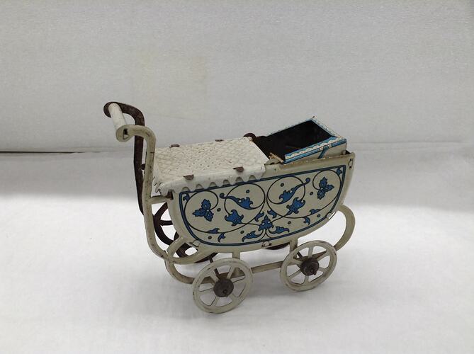 Miniature white metal pram containing a very small baby doll swaddled in beaded white cloth. This was owned and used by Mirka Mora in her art studio in Tanner Street Richmond from the year 2000. Mirka located there after having lived in a number of residences and studios in Melbourne CBD, Toorak, and St Kilda. This item was part of a group of small dolls, prams and furniture stored in a timber wine box (HT 55702).