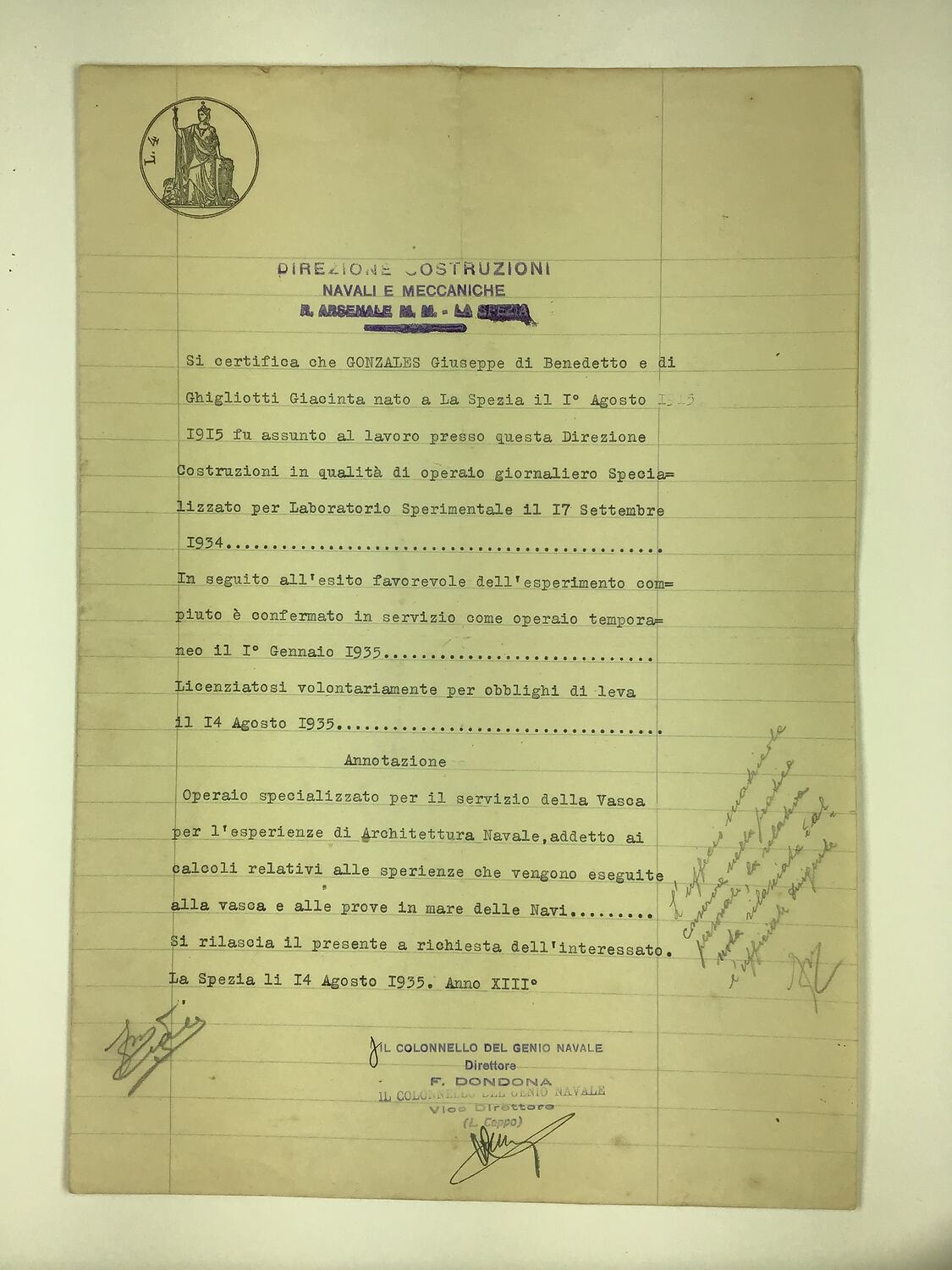 Typed employment reference for Giuseppe Gonzales from the Constructions Director, Naval & Mechanical, La Spezia, Italy, 14 August 1935. It outlines his qualifications and employment history in Italian language.