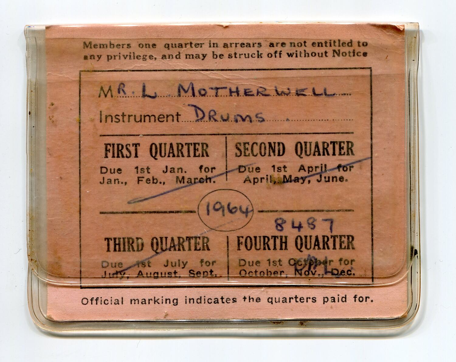 Sections filled out with pen: Name: Mr L. Motherwell Instrument: Drums First, second and third quarters crossed off as having been paid (Jan-Mar, Apr-Jun, July-Sep)