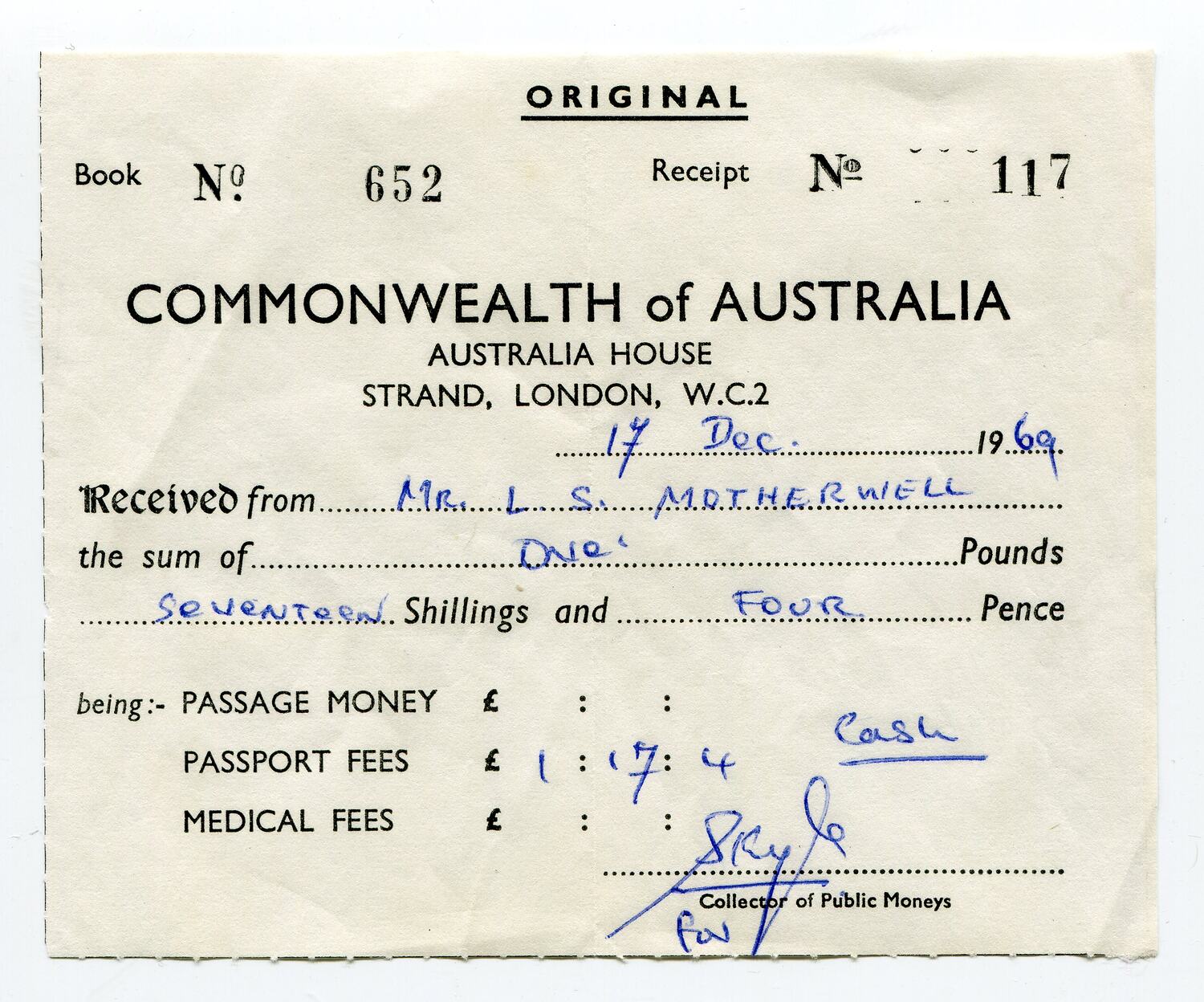 Receipt from Australia House, London to certify that the sum of one pound, seventeen shillings and four pence were received from Lindsay Motherwell for passport fees. Lindsay Motherwell was a drummer who travelled through Africa playing music, and settled in South Africa from 1967-1969 before travelling back to Australia in 1970.