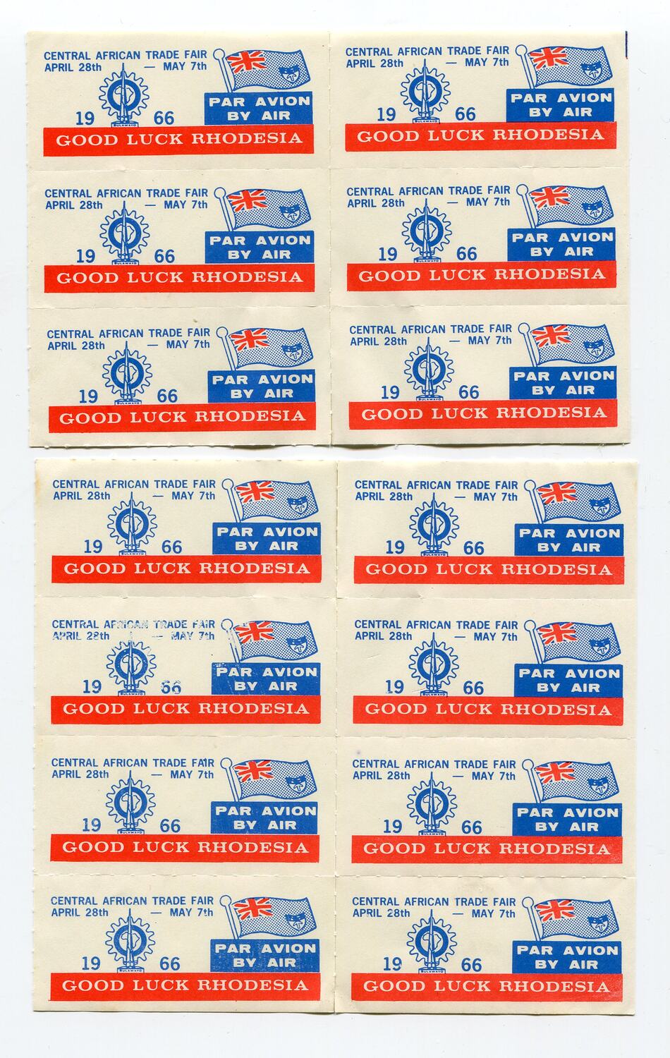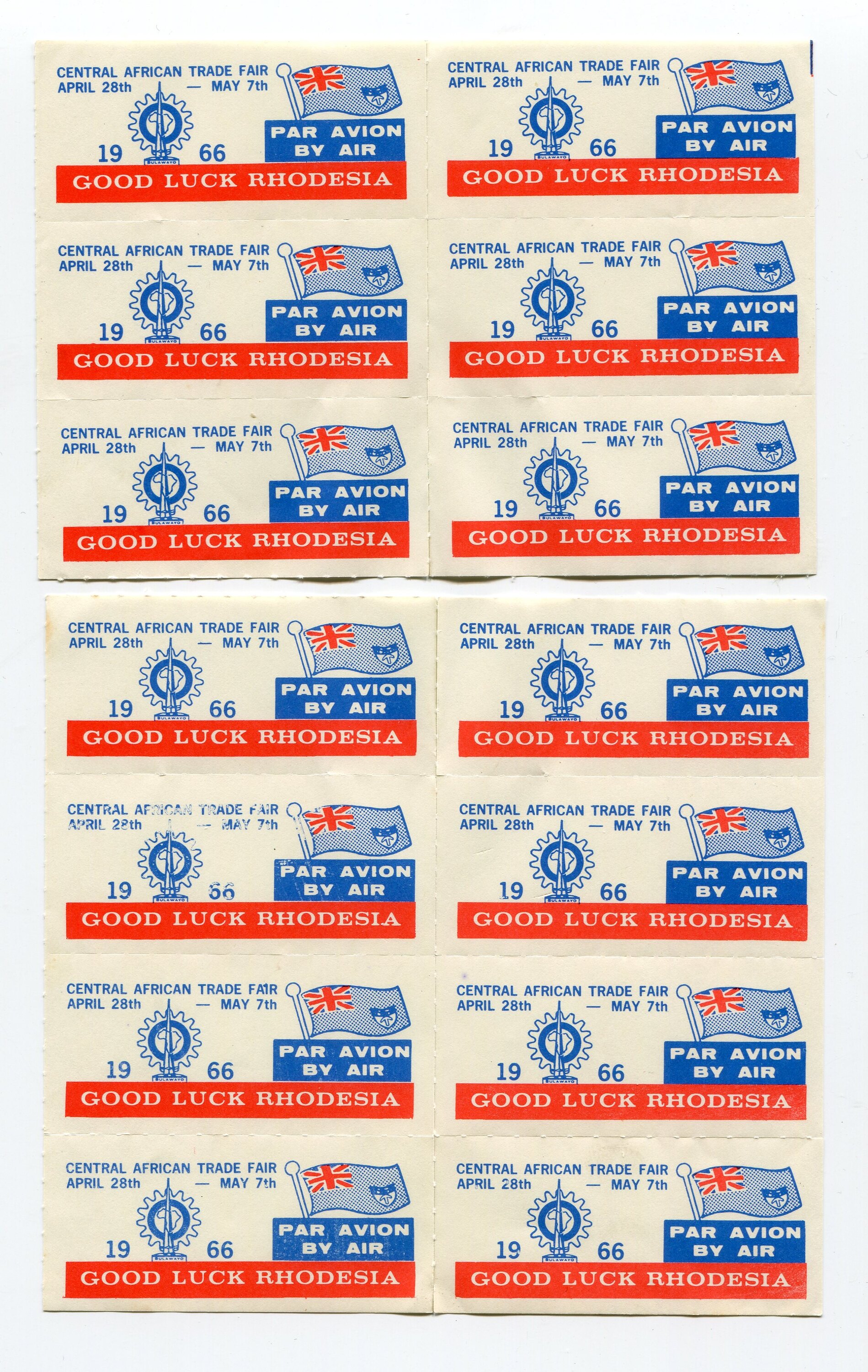 Several blocks of stamps with the slogan 'Good Luck Rhodesia' on them, along with the Southern Rhodesian flag and the date 1966. They state 'PAR AVION BY AIR' and also mention the 'CENTRAL AFRICAN TRADE FAIR APRIL 28th - MAY 7th'