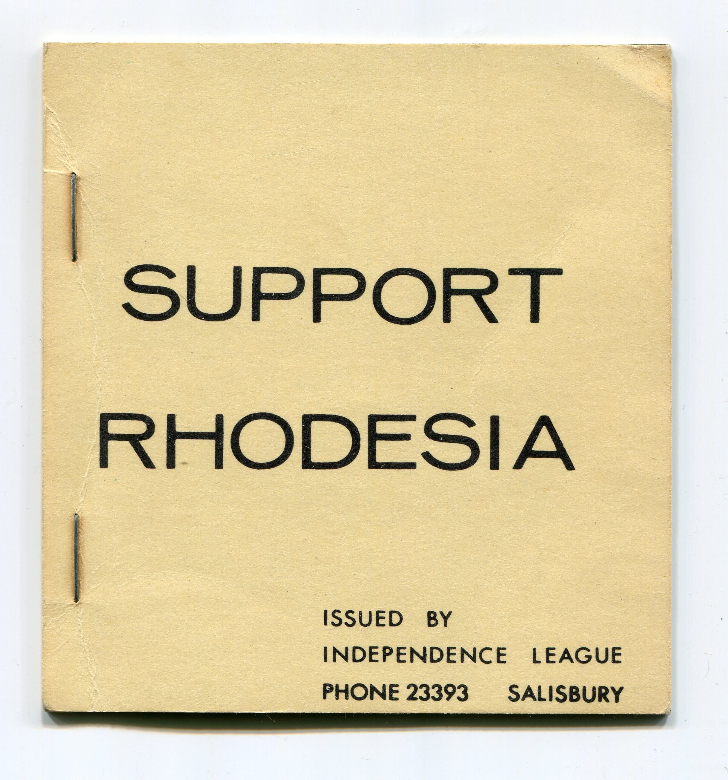 Booklet of stamps sold to support Rhodesia's independence which was declared in 1965, presumably collected by Lindsay Motherwell during his travels around Africa in the 1960s. Lindsay Motherwell was a drummer who travelled through Africa playing music, and settled in South Africa from 1967-1969 before moving back to Australia in 1970.