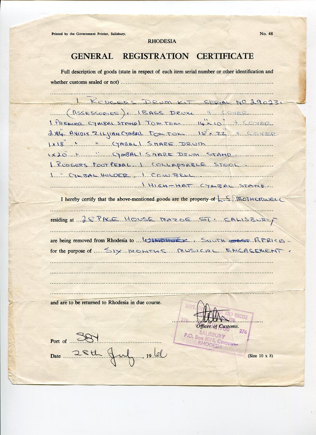 General Registration Certificate itemising drum kit, including all the pieces, as well as Lindsay's address in Rhodesia. Stamped and signed 28 Jul 1966.