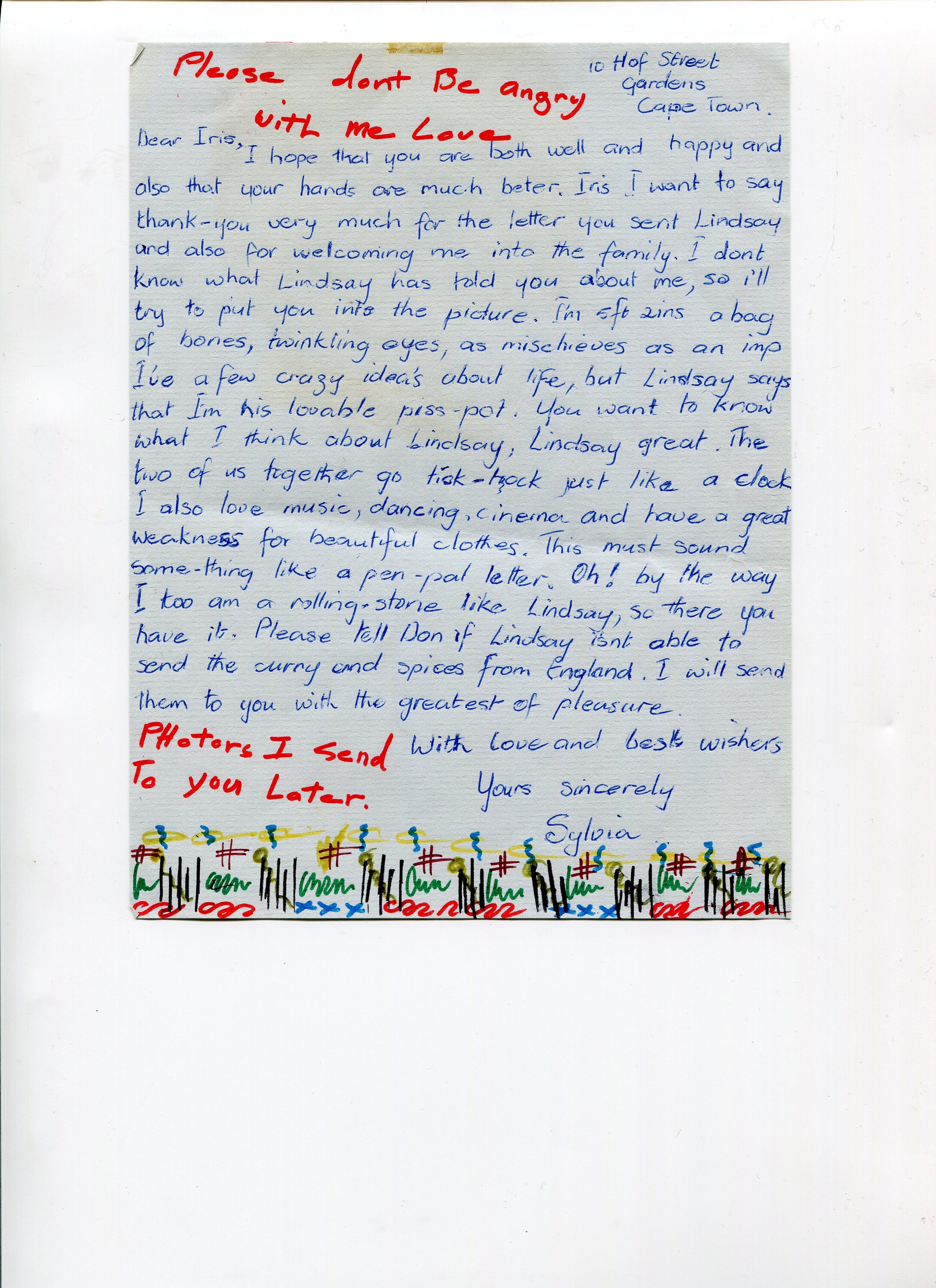 Letter, undated. Annotated with comments 'please don't be angry with me love' and 'photors [sic] I send to you later'.