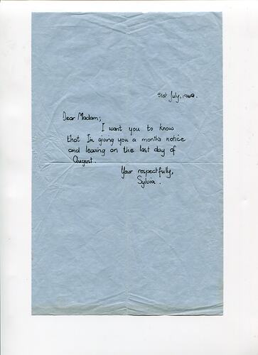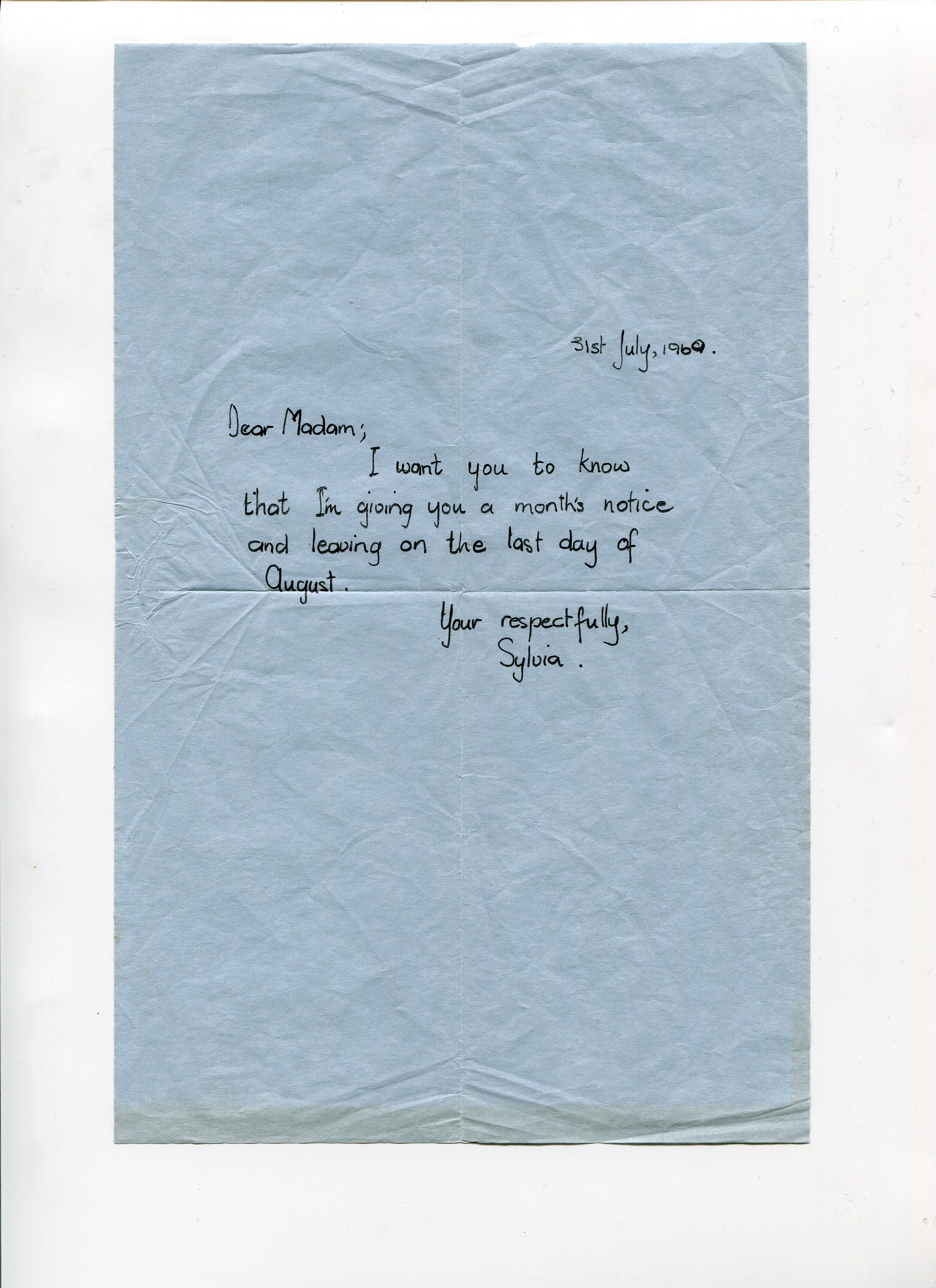 31st July, 1969. Dear Madam; I want you to know that I'm giving you a month's notice and leaving on the last day of August. Yours respectfully, Sylvia.