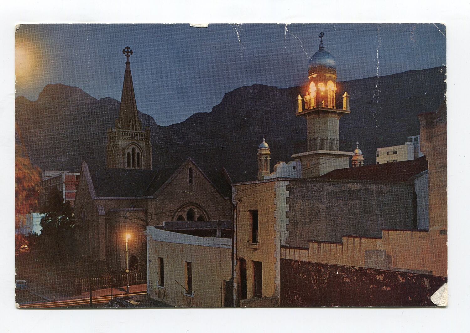 Postcard with image of a street in front of Tabletop Mountain on front.