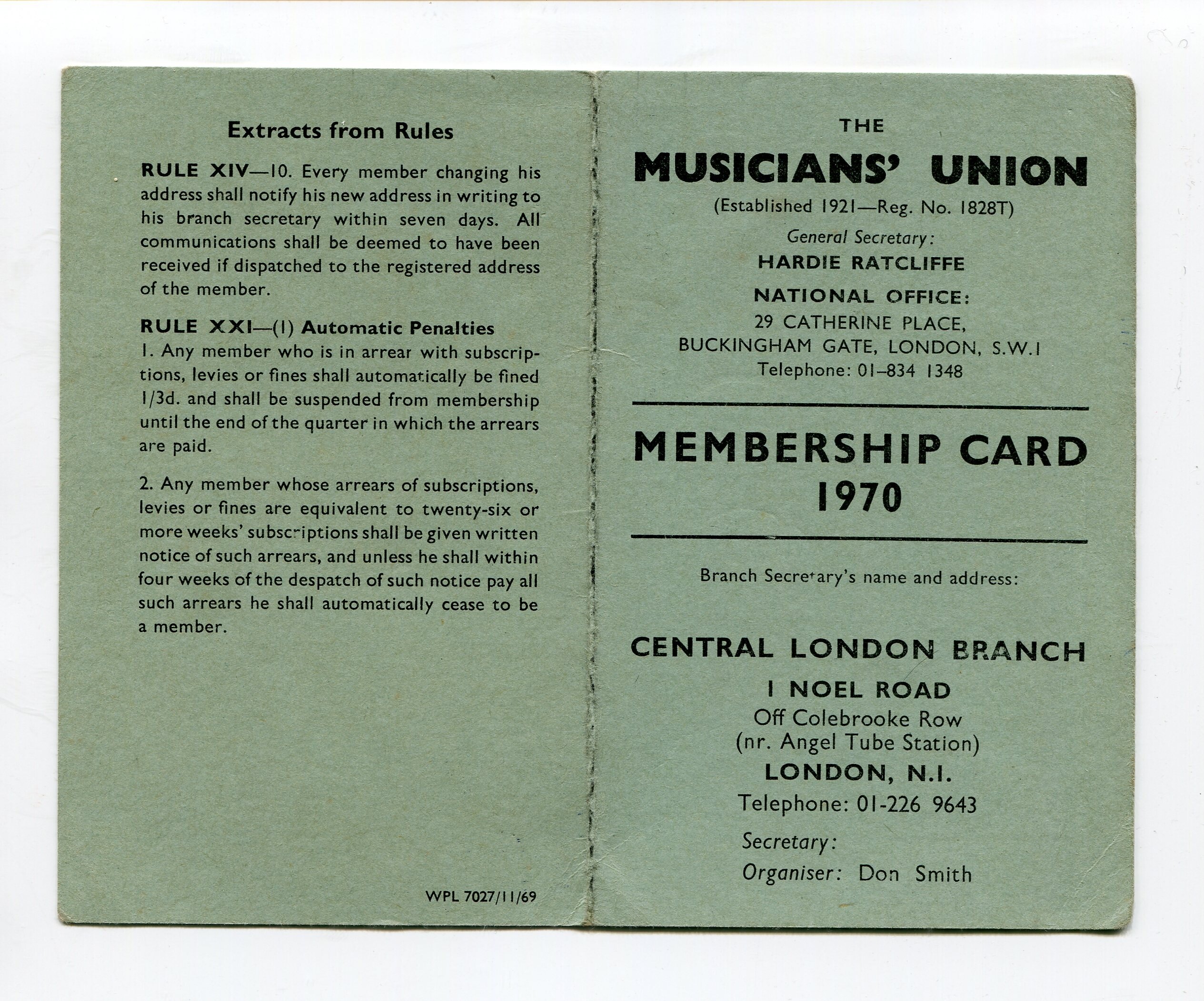 Blue cardboard membership card consisting of one piece of cardboard folded in half. On the front it states that it is a 1970 Membership Card for The Musicians' Union, Central London Branch. Lindsay paid 3/6d for the quarter to the 28th March. Lindsay Motherwell was a drummer in various jazz bands, who travelled Africa before marrying in London and migrating back to Australia.