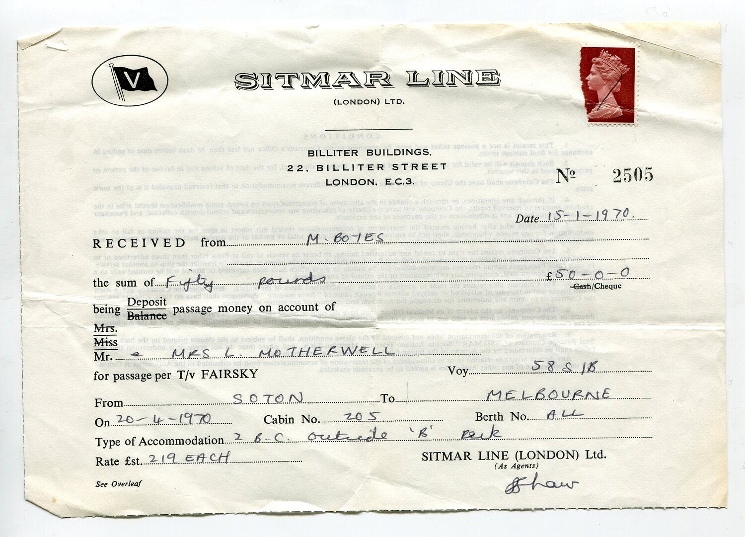 Receipt stating payment was recieved from 'M Boyes' on the 15 Jan 1970, as a deposit of passage money on behalf of Mr & Mrs L. Motherwell. The details of the ticket are from Soton (Southampton) to Melbourne, departing 20 Apr 1970, all berths in Cabin 205 at a rate of 219 pounds each.