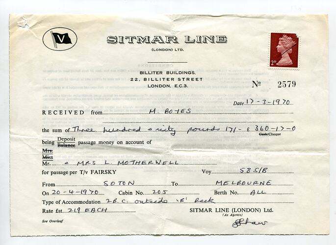 Receipt with payment received from 'M Boyes' on the 17 Mar 1970, as a deposit of passage money on behalf of Mr & Mrs L. Motherwell. The details of the ticket are from Soton (Southampton) to Melbourne, departing 20 Apr 1970, all berths in Cabin 205 at a rate of 219 pounds each.