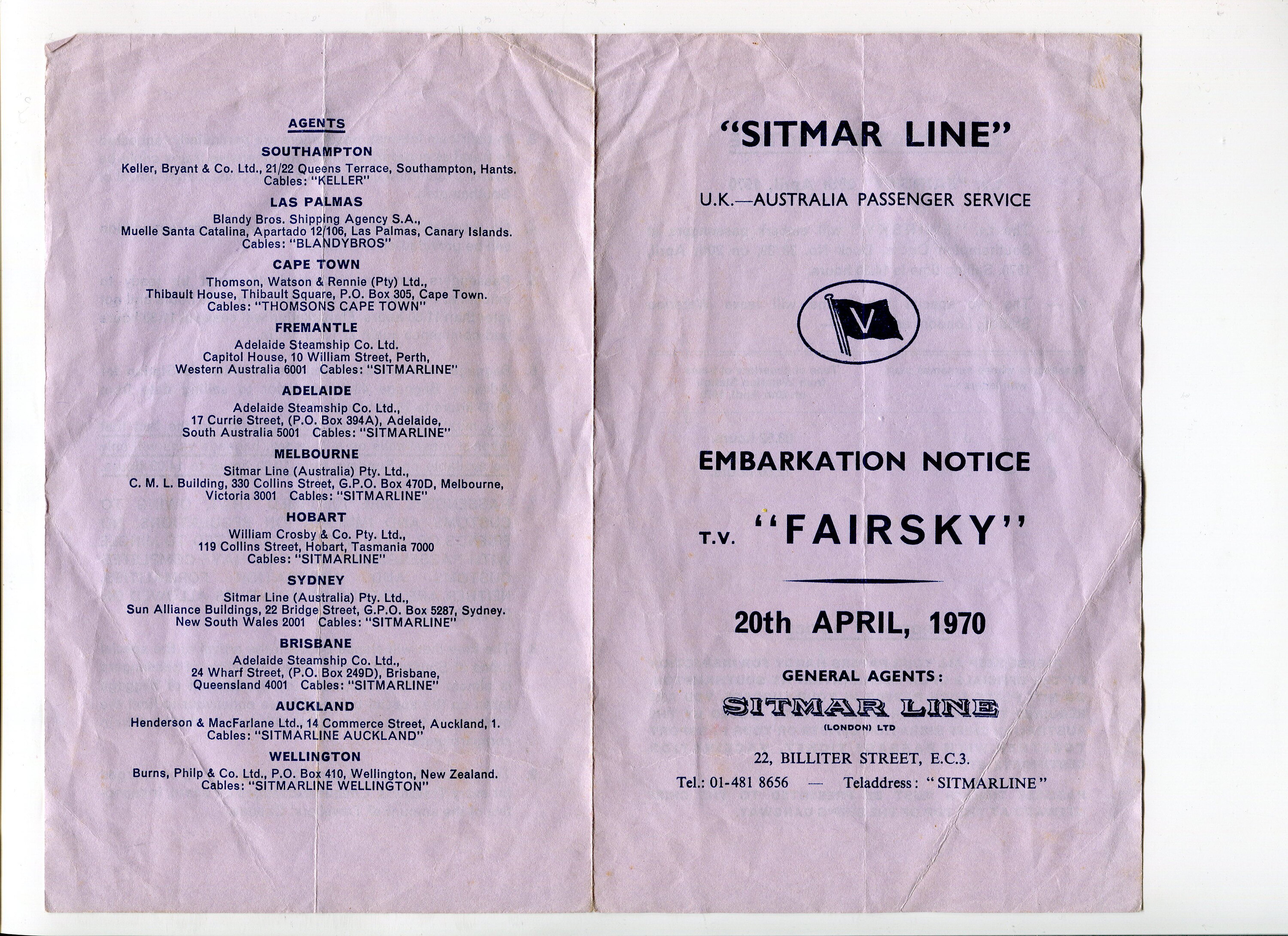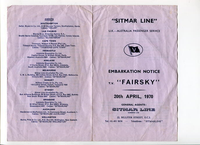 Embarkation Notice for the T.V. "Fairsky" on the "Sitmar Line" U.K. - Australia Passenger Service, dated 20th April 1970, It contains information and rules about boarding processes, and how to get baggage onto the boats. On the back are listed the Agents of the Sitmar Line. Lindsay and Sylvia met in South Africa, married in London and then relocated to Australia to start their lives together.