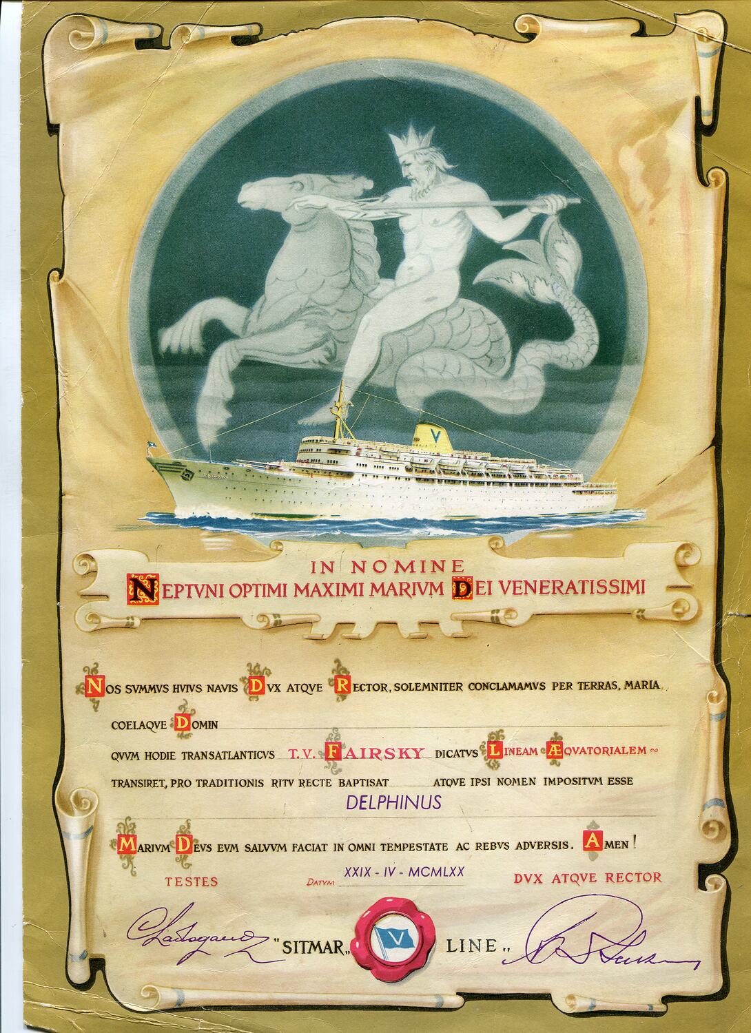 Certificate written entirely in Latin, and decorated to look like an old scroll. There is also a large image of a Sitmar Line ship central to the certificate. At top is an image of the god Neptune riding a sea-horse above a colour image of one of the Sitmar Line cruise ships.