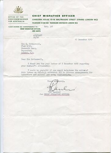 Letter to Mrs Motherwell from the Chief Migration Officer at Canberra House, London. It is in response to a lettter about her husband's citizenship and requests that she ring the office to organise interviews and medical appointments, presumably in preparation for organising her visa. Lindsay Motherwell and Sylvia Boyes met in South Africa, married in London and then relocated to Australia to start their lives together.