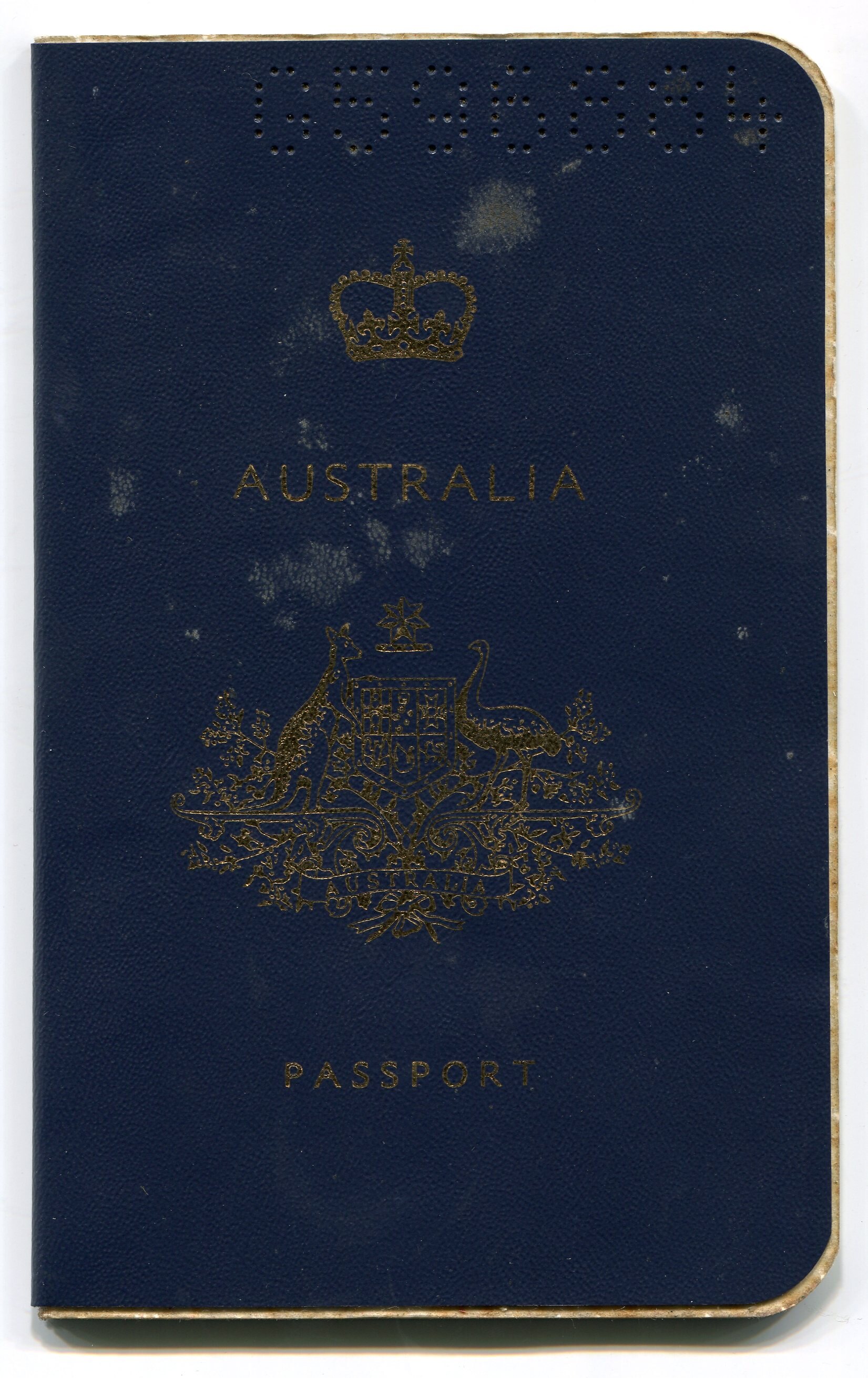 Australian passport belonging to Lindsay Motherwell. It was issued in 1969 in London and valid for five years. It includes a black and white photograph of Lindsay. It also contains stamps from his exit at Southampton and a visit pass from Singapore in 1972. Lindsay was a drummer from Melbourne who travelled through Africa in the 1950s and 60s before marrying Sylvia Boyes from South Africa, and then returning to Australia with her.