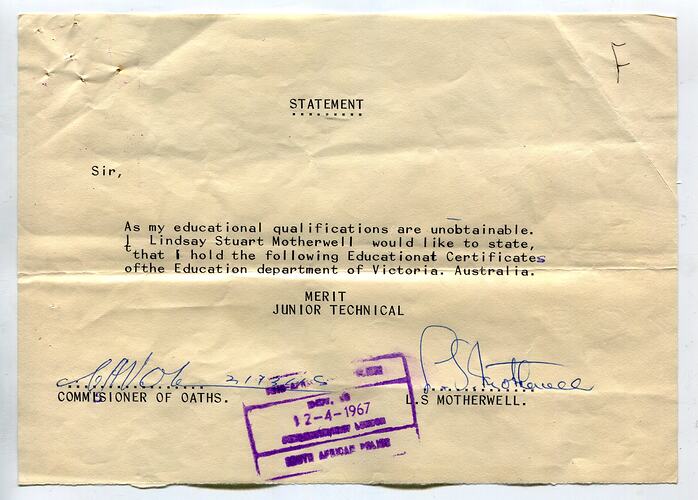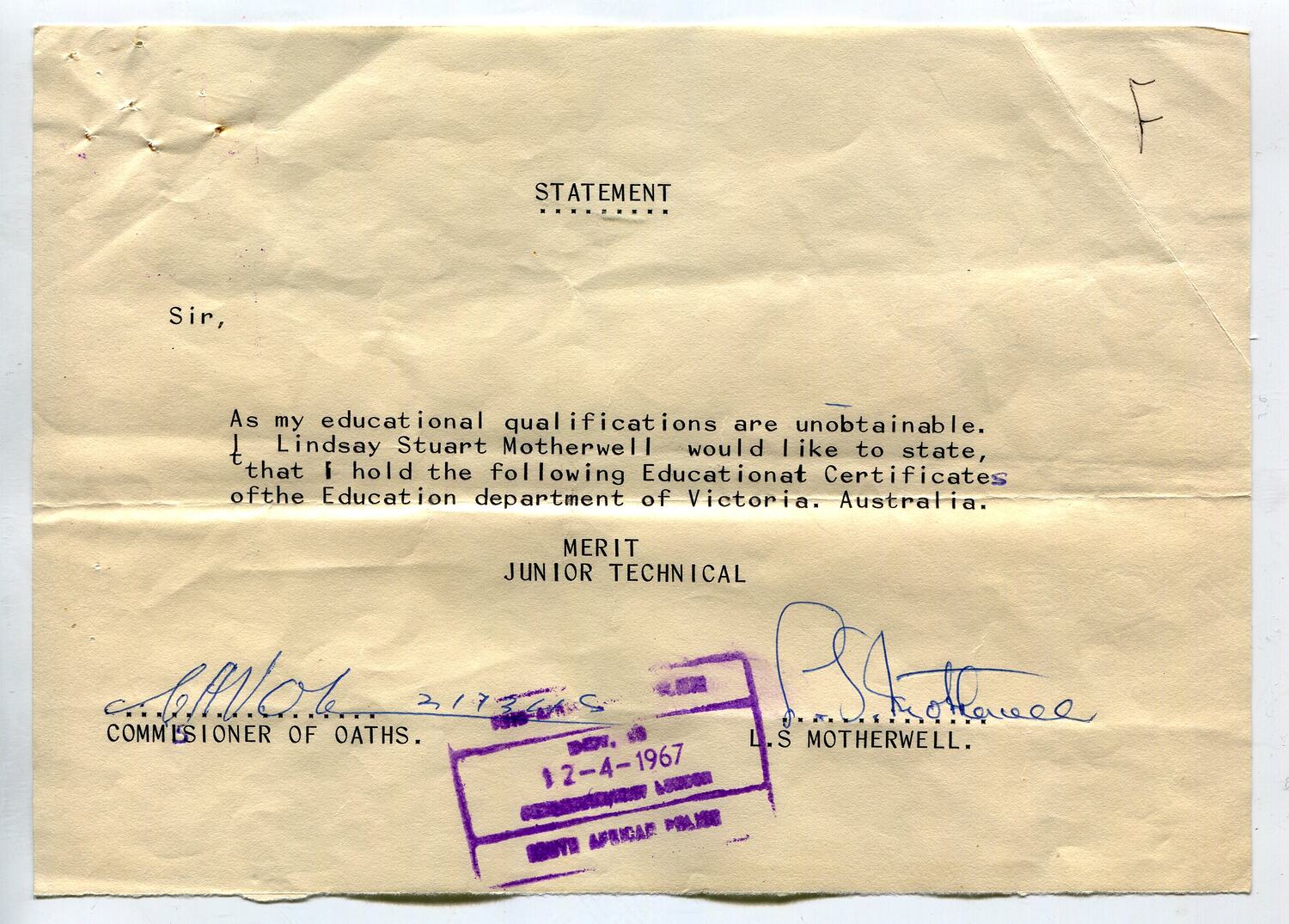 Official statement, made under oath by Lindsay Motherwell to the Commissioner of Oaths, South African Police on 12 April 1967. It states that his educational qualifications are unobtainable, and therefore this statement has been made instead. Lindsay states that he has received a Junior Technical Merit qualification from the Education Department of Victoria, Australia. This was supplied as part of his application for permanent residency in South Africa. This item is one of seven documents relating to Lindsay's permanent residency (HT 56326 HT 56364 HT 56365 HT 56366 HT 56367 HT 56368). Lindsay Motherwell was a drummer who travelled through Africa playing music, and settled in South Africa from 1967-1969, before returning to Australia via London.