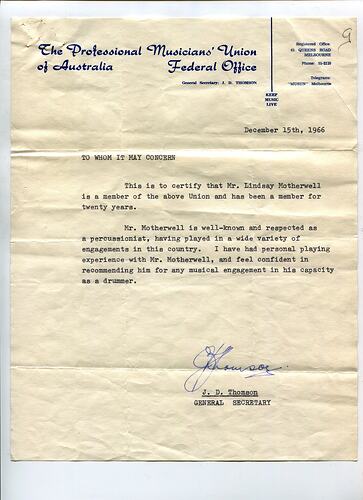 Letter of recommendation written by J.D. Thomson, the General Secretary of the Professional Musicians' Union of Australia on 15 December 1966. It states that Lindsay Motherwell had been part of the Musicians' Union of Australia for 20 years and had played in Australia, as well as with Thomson himself. He recommends Lindsay for any musical employment. This was supplied as part of his application for permanent residency in South Africa. This item is one of seven documents relating to Lindsay's permanent residency (HT 56326 HT 56363 HT 56365 HT 56366 HT 56367 HT 56368). Lindsay Motherwell was a drummer who travelled through Africa playing music, and settled in South Africa from 1967-1969, before returning to Australia via London.