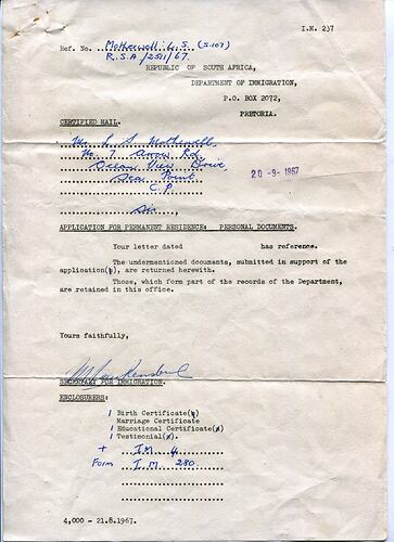 Letter from the Department of Immigration, South Africa to Lindsay Motherwell, giving notice of returned documents. It was sent with a package of documents, which are listed at the bottom of the letter. This item is one of seven documents relating to Lindsay's permanent residency (HT 56326 HT 56363 HT 56364 HT 56365 HT 56367 HT 56368). Lindsay Motherwell was a drummer who travelled through Africa playing music, and settled in South Africa from 1967-1969, before returning to Australia via London.
