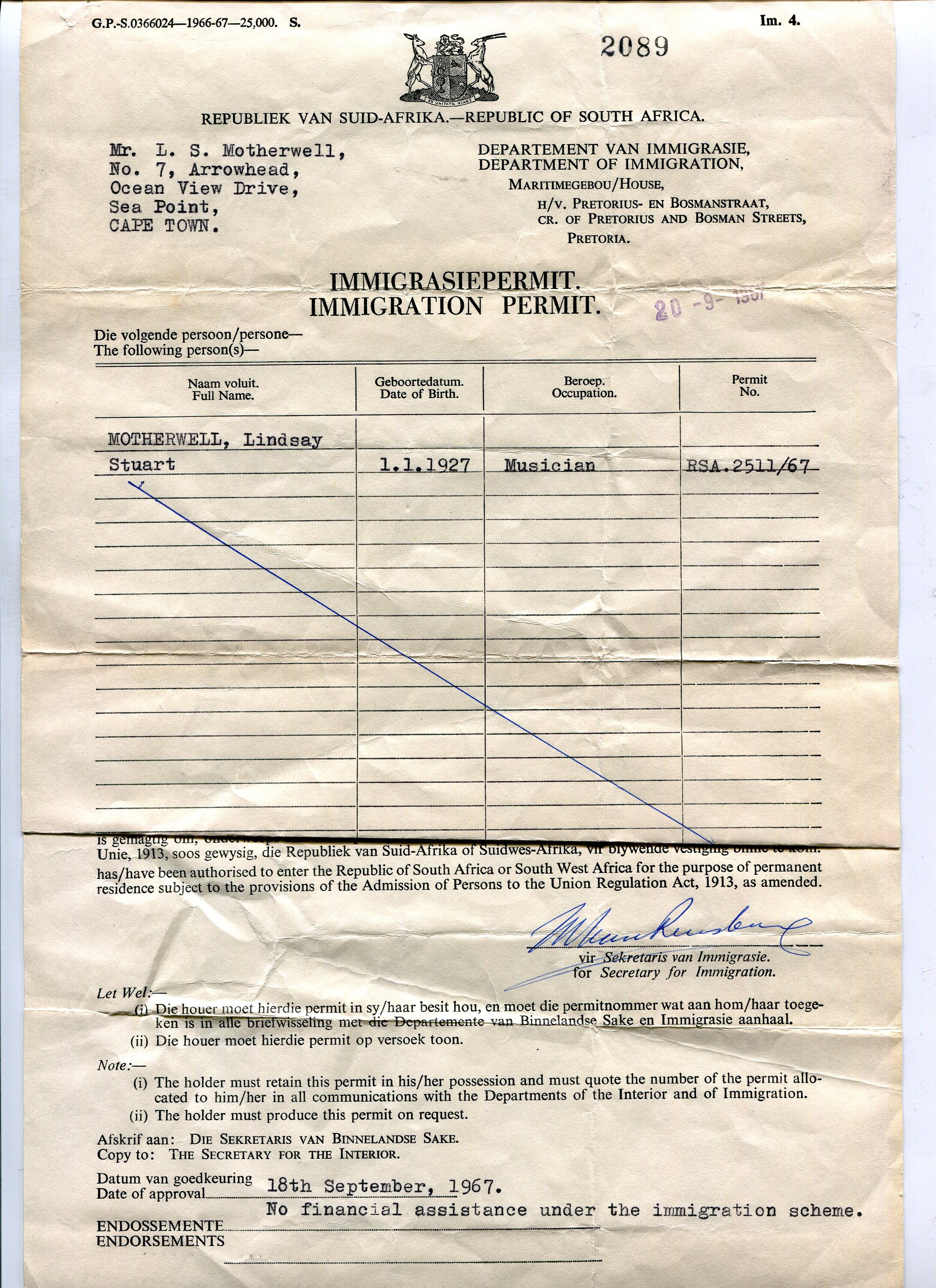 Mr. L. S. Motherwell, No. 7, Arrowhead, Ocean View Drive, Sea Point, CAPE TOWN. 20-9-1967 MOTHERWELL, Lindsay Stuart 1.1.1927 Musician RSA.2511/67