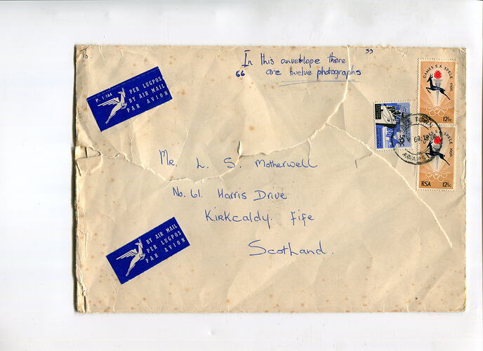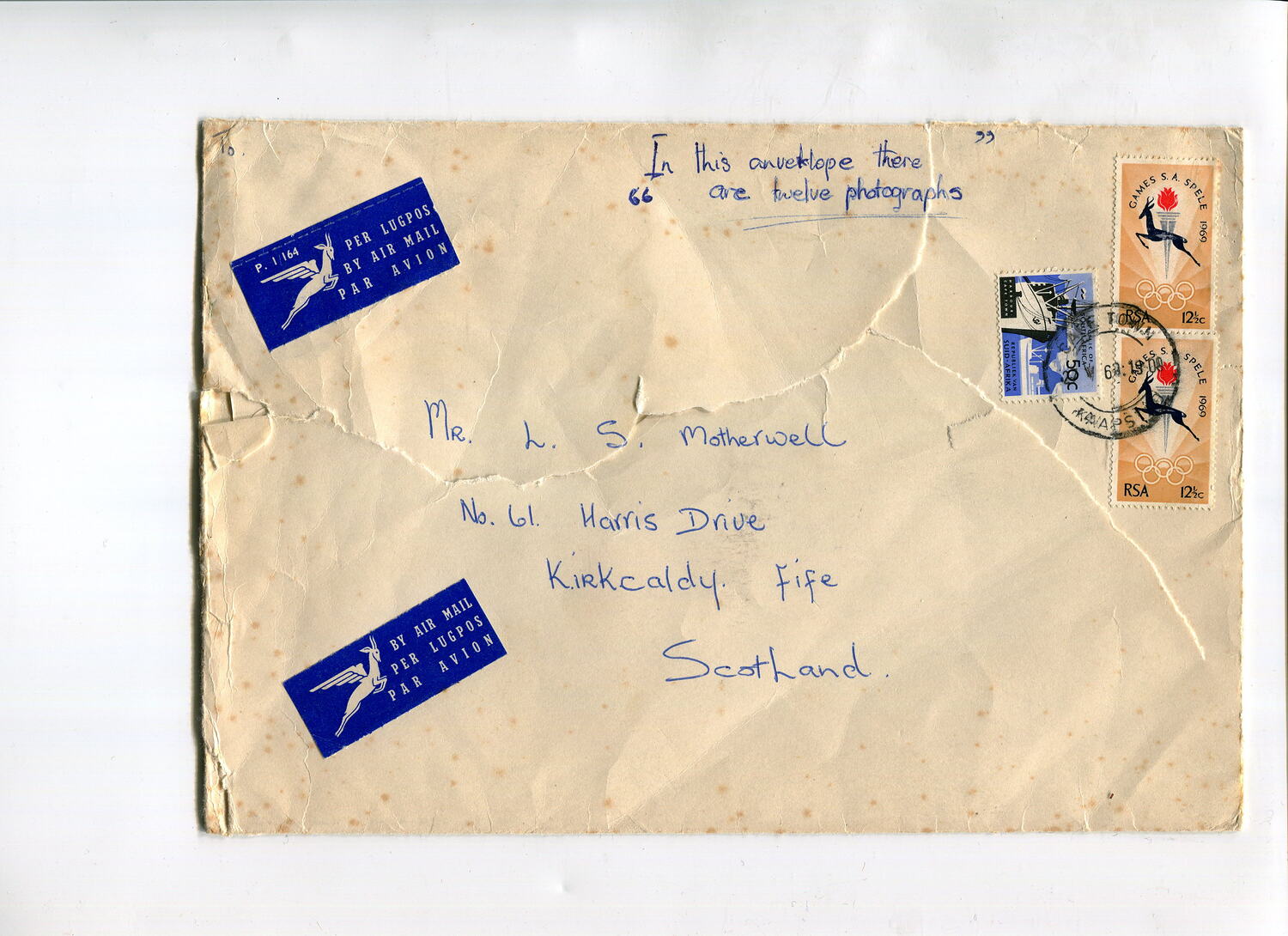 An envelope addressed to MR. L. S. Motherwell at No. 61 Harris Drive Kirkcaldy, Fife, Scotland. The return address is Miss M.M.S. Boyes 10 HOF STREET, GARDENS, CAPE TOWN. SOUTH AFRICA. It has 3 stamps attached, as well as 4 "by air mail" stickers. Sylvia has also written a few little notes on it, such as "In this envelope there are twelve photographs" and "Postman, Postman don't be slow be like Elvis go man go".