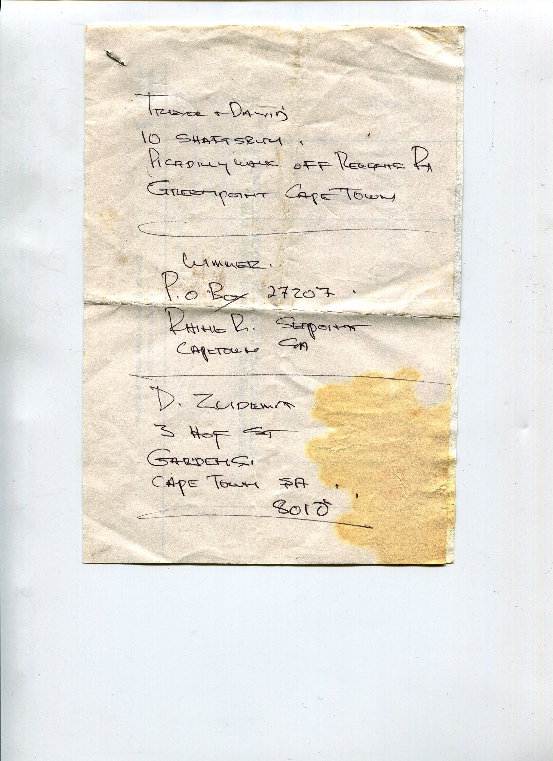 TREVOR + DAVID 10 SHAFTSBURY, PICADILLY WAY OFF REGENTS RD GREENPOINT CAPE TOWN ________________________________ CLIMMER. P.O. BOX 27207. RHINE RD. SEAPOINT CAPE TOWN SA ________________________________ D. ZUIDEMA 3 HOF ST GARDENS. CAPE TOWN SA . . 8010 ________________________________ MATRON + SISTER KLOPPER PRIVATE BAG XI. MILL ST. P.O.