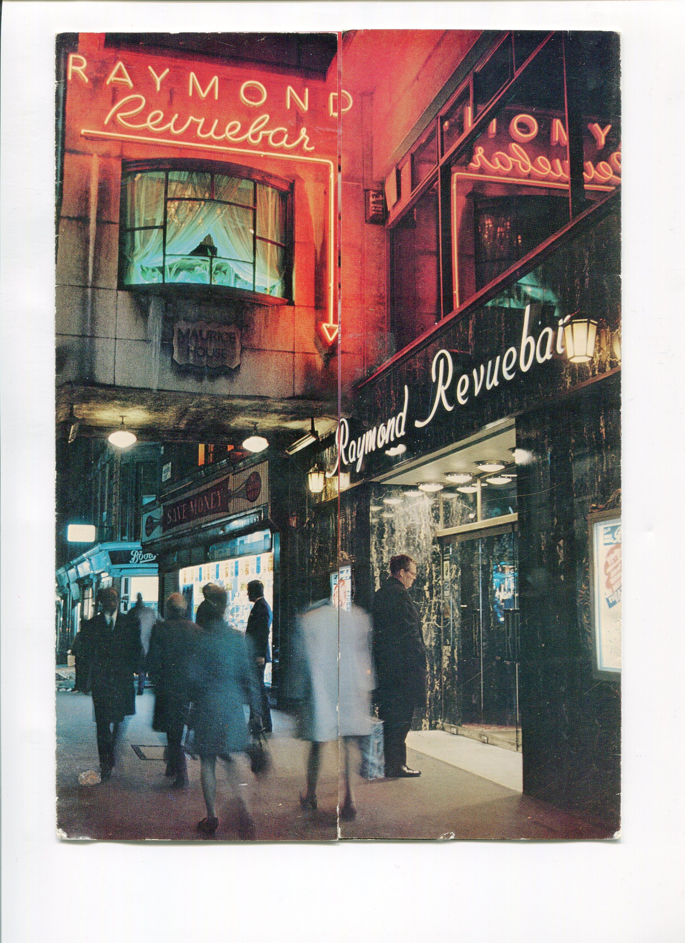 Flyer, two sides fold into the centre with an image of the Raymond Revuebar at night from the street. It opens out into a central image of a woman wearing only panties and jewellery, lit but a red light with a white polka dot pattern in it. On the left wing is some information abot Paul Raymond, the Foyer and the Golden City Room. On the right wing is information about the Topless Band, the Theatre Room and the Birdcage Restaurant and Bar. On the back are six photos of a woman posed in various half-naked positions with different coverings.