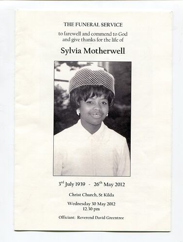 Funeral booklet for the funeral service of Sylvia Motherwell, held at Christ Church, St Kilda, 30 May 2012. Sylvia moved to Australia with her Australian husband, Lindsay Motherwell, who she met in her native South Africa. Lindsay died in 2006.