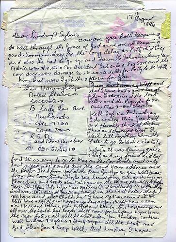 Aerogram written by Mary Legget to Lindsay and Sylvia Motherwell on 17 August 1994. It is a general chatty letter which provides informationabout Lindsay and Sylvia's lives as well as the situation in South Africa. Lindsay and Sylvia Motherwell always stayed in contact with their old friends from South Africa after they moved to Australia in 1970.
