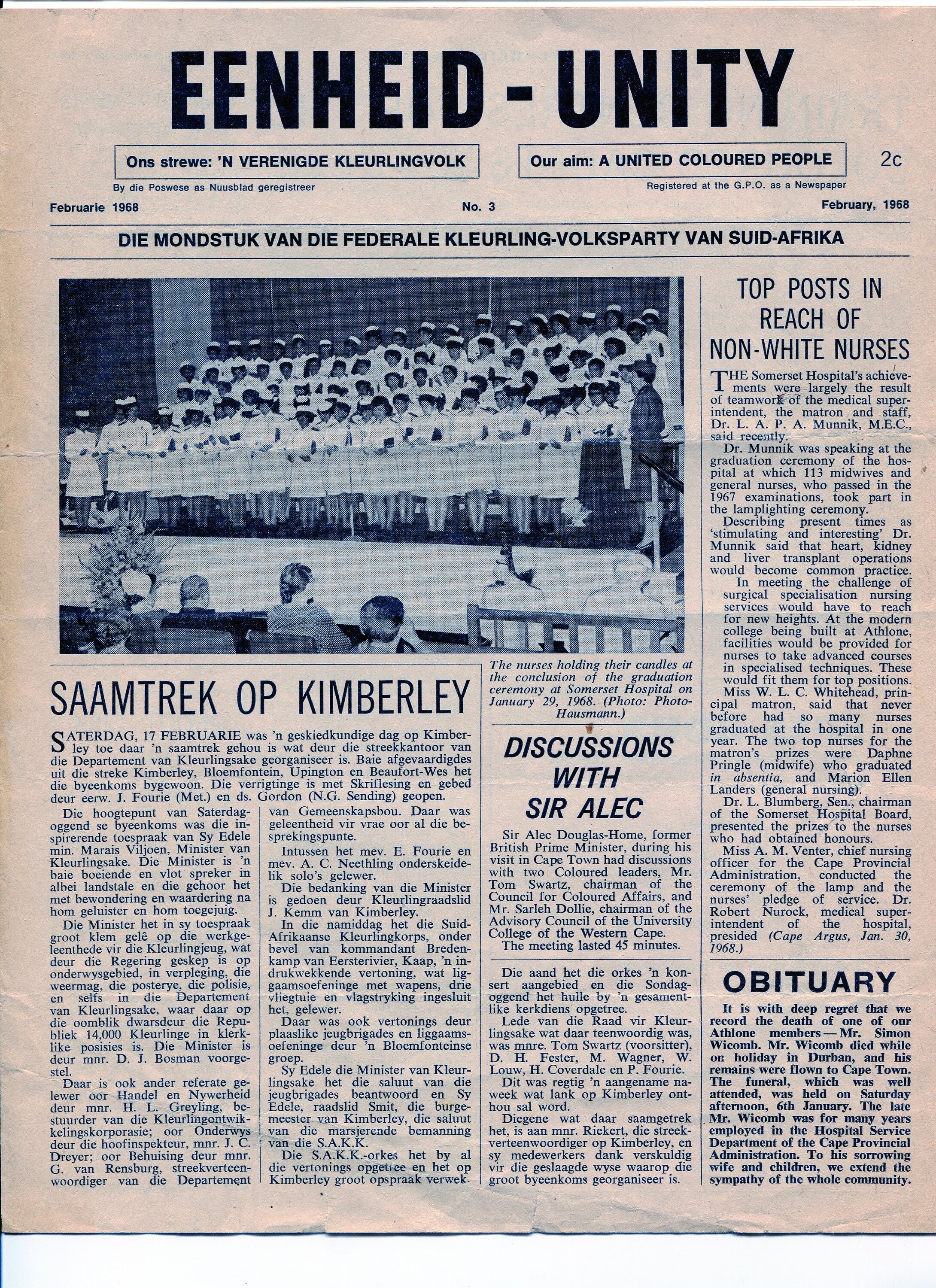 It includes stories about a record number of coloured nurses graduating from the Somerset Hospital's training program and one about training centres for coloured cadets, as well as a Party News Section.