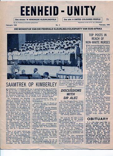 Four-page Eenheid-Unity newspaper which is a bilingual South African newspaper connected to the Federal Coloured People's Party. This demonstrates the progressive ideas and actions of Lindsay and Sylvia while they were both living under apartheid.
