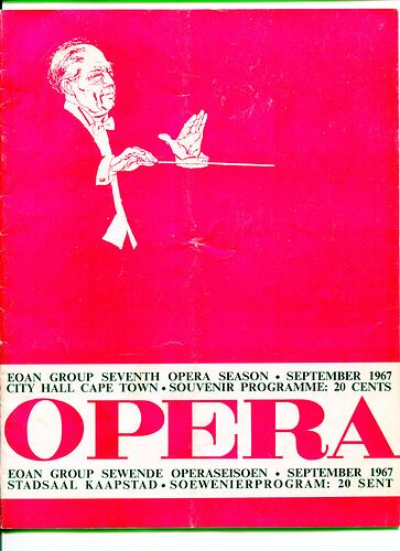 Souvenir programme, front cover is hot pink and has a white lino-cut style image of a conductor on it. Across the bottom is a banner which says "OPERA" in big pink letters, with details of the in English above the title and in Afrikaans below it.